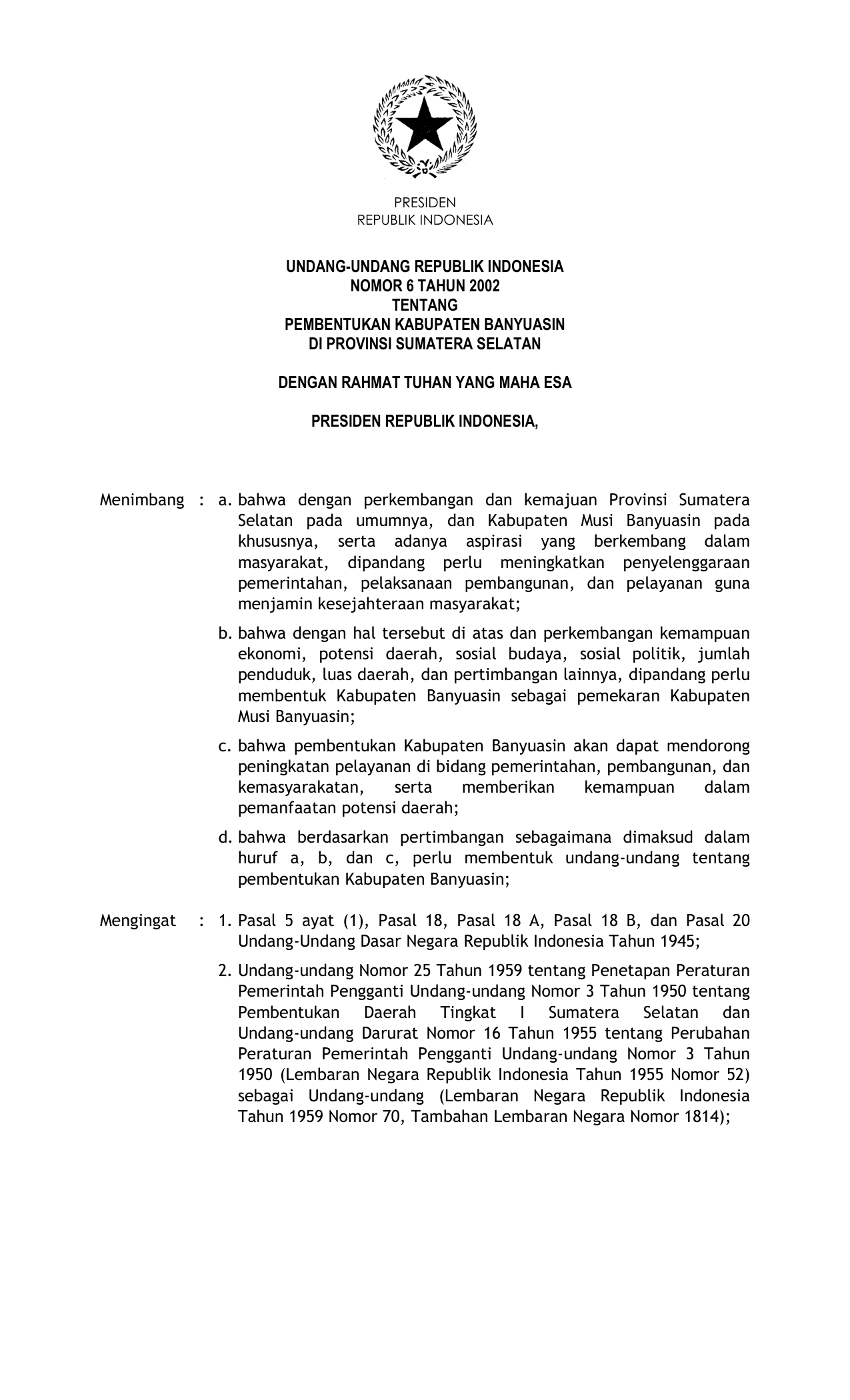 UU Nomor 6 Tahun 2002 | Undang-Undang Nomor 6 Tahun 2002 tentang PEMBENTUKAN KABUPATEN BANYUASIN DI PROVINSI SUMATERA SELATAN