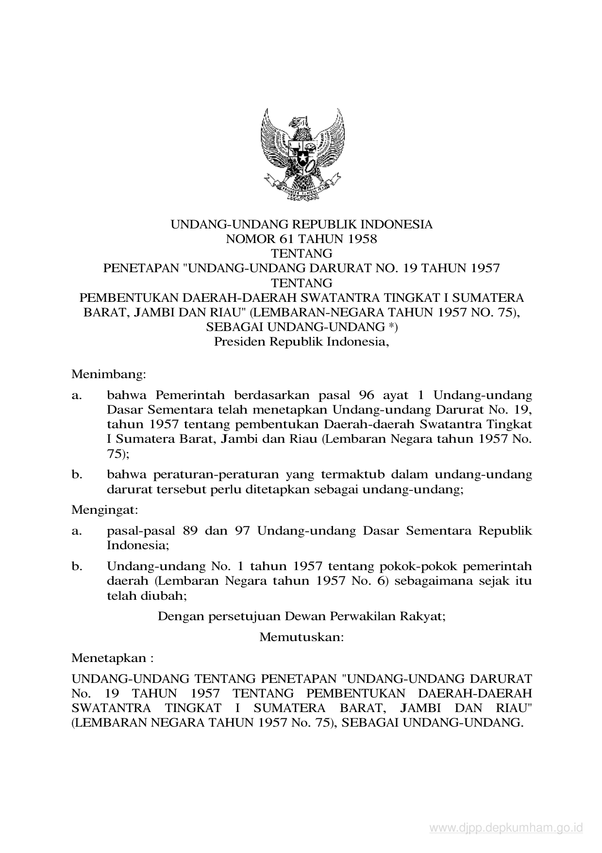 UU Nomor 61 Tahun 1958 | Undang-Undang Nomor 61 Tahun 1958 tentang PENETAPAN "UNDANG-UNDANG DARURAT NO. 19TAHUN 1957 TENTANG PEMBENTUKAN DAERAH-DAERAH SWATANTRA TINGKAT I SUMATERA BARAT, JAMBI DAN RIAU" (LEMBARAN-NEGARA TAHUN 1957 NO. 75), SEBAGAI UNDANG-UNDANG
