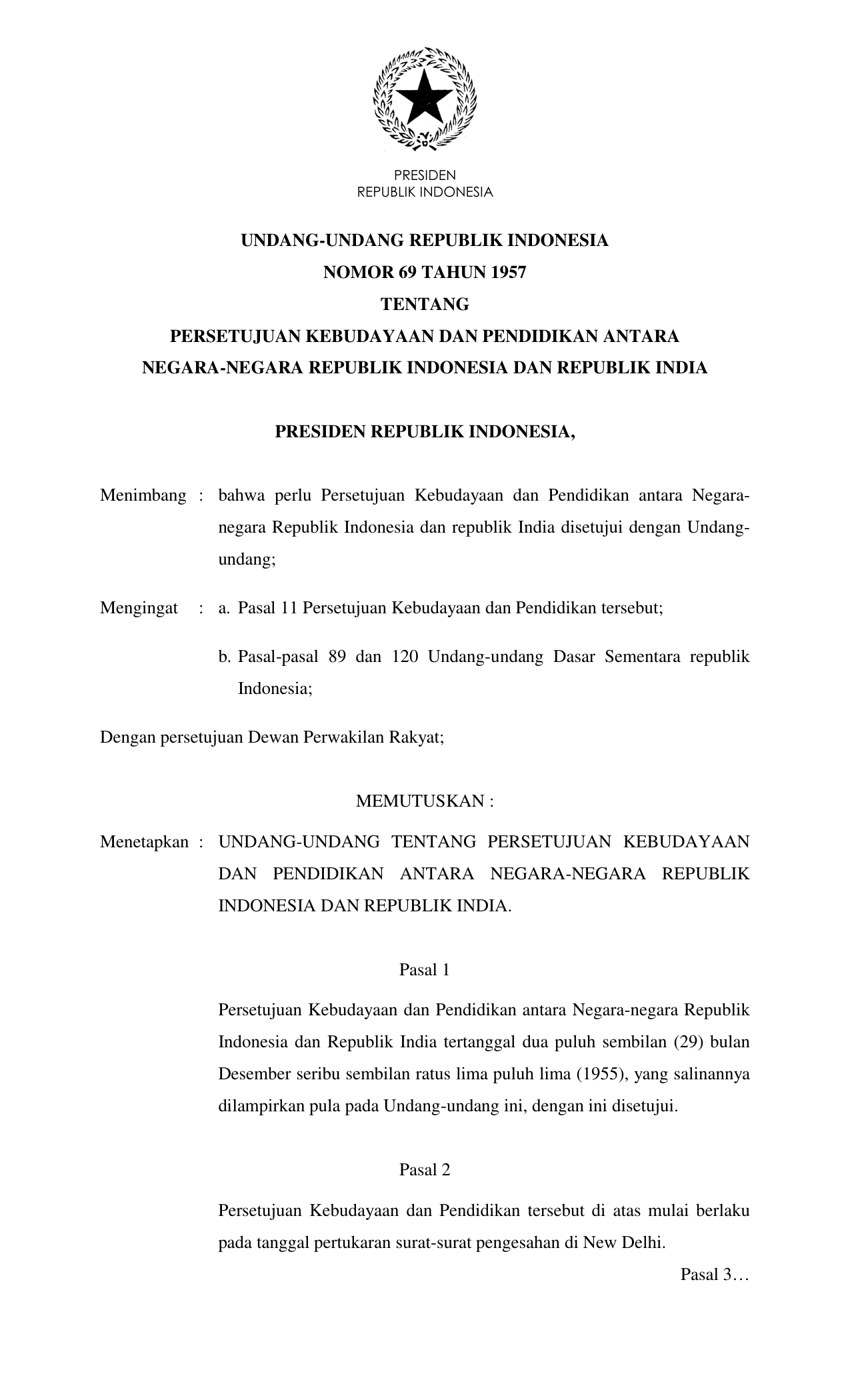 UU Nomor 69 Tahun 1957 | Undang-Undang Nomor 69 Tahun 1957 tentang PERSETUJUAN KEBUDAYAAN DAN PENDIDIKAN ANTARA NEGARA-NEGARA REPUBLIK INDONESIA DAN REPUBLIK INDIA