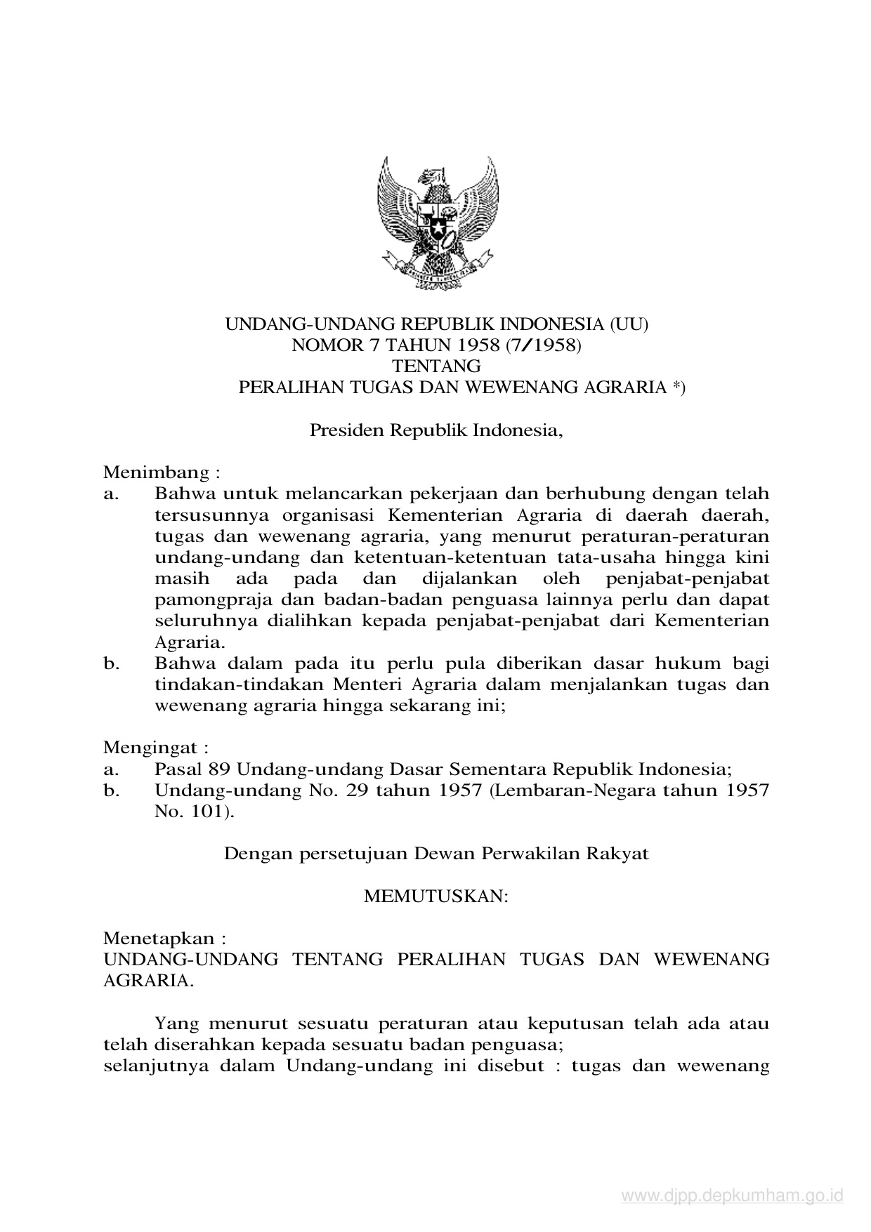 UU Nomor 7 Tahun 1958 | Undang-Undang Nomor 7 Tahun 1958 tentang PERALIHAN TUGAS DAN WEWENANG AGRARIA