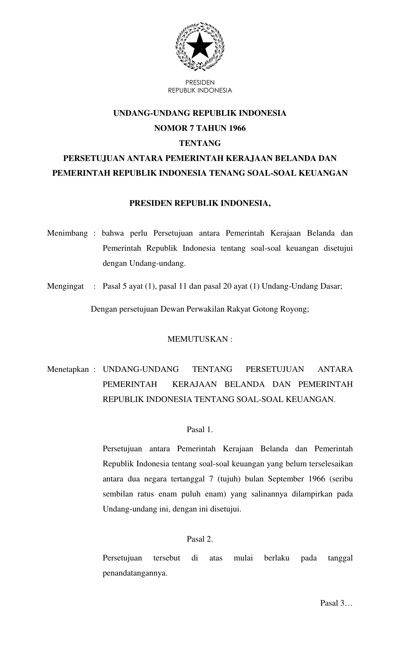 UU Nomor 7 Tahun 1966 | Undang-Undang Nomor 7 Tahun 1966 tentang PERSETUJUAN ANTARA PEMERINTAH KERAJAAN BELANDA DAN PEMERINTAH REPUBLIK INDONESIA TENANG SOAL-SOAL KEUANGAN