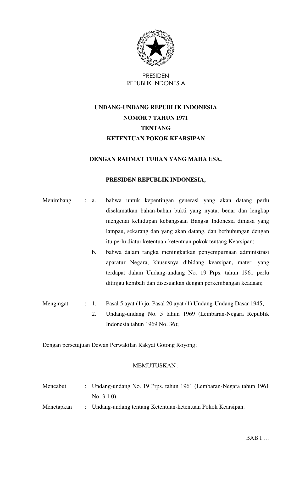 UU Nomor 7 Tahun 1971 | Undang-Undang Nomor 7 Tahun 1971 tentang KETENTUAN-KETENTUAN POKOK KEARSIPAN