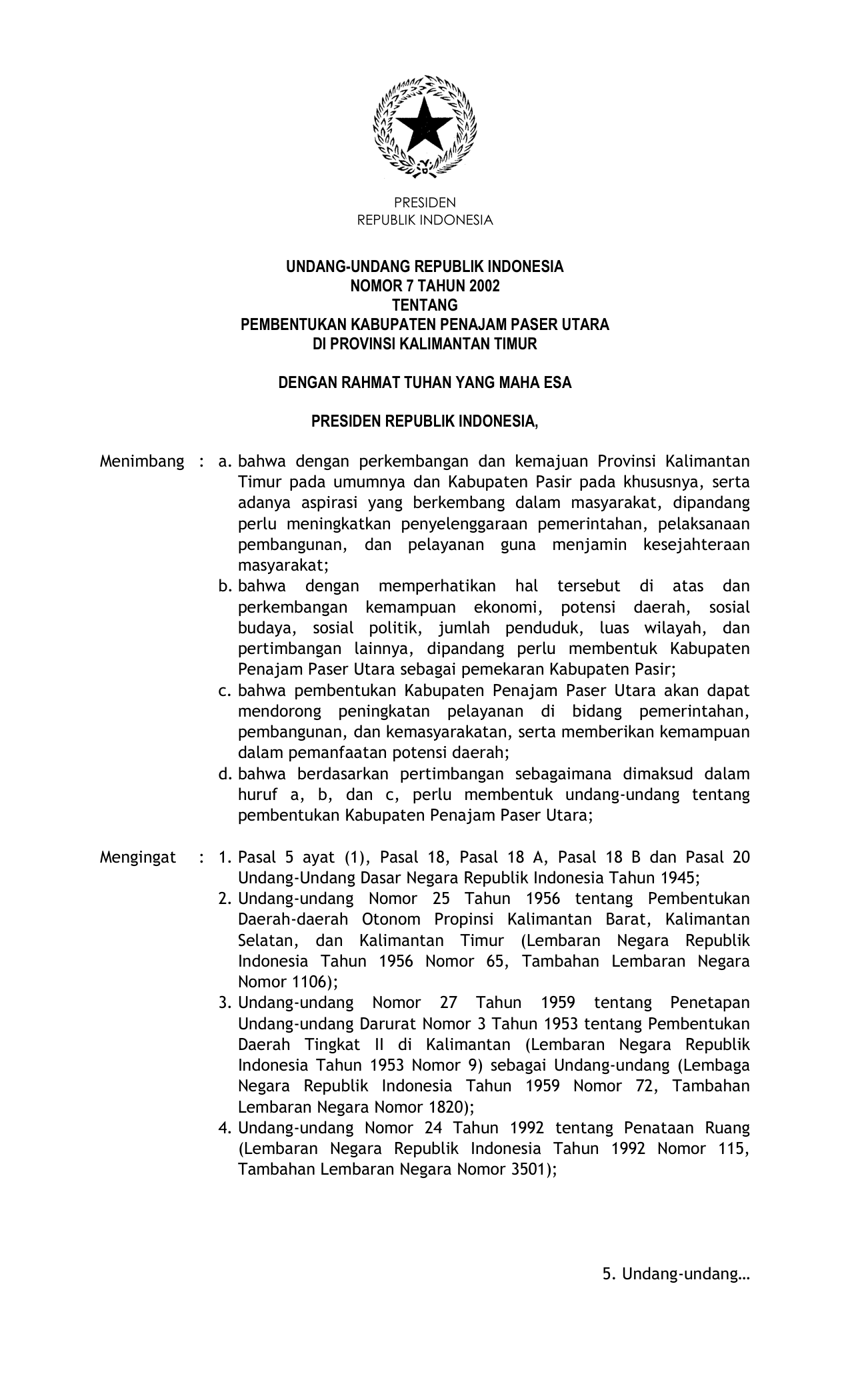 UU Nomor 7 Tahun 2002 | Undang-Undang Nomor 7 Tahun 2002 tentang PEMBENTUKAN KABUPATEN PENAJAM PASER UTARA DI PROVINSI KALIMANTAN TIMUR