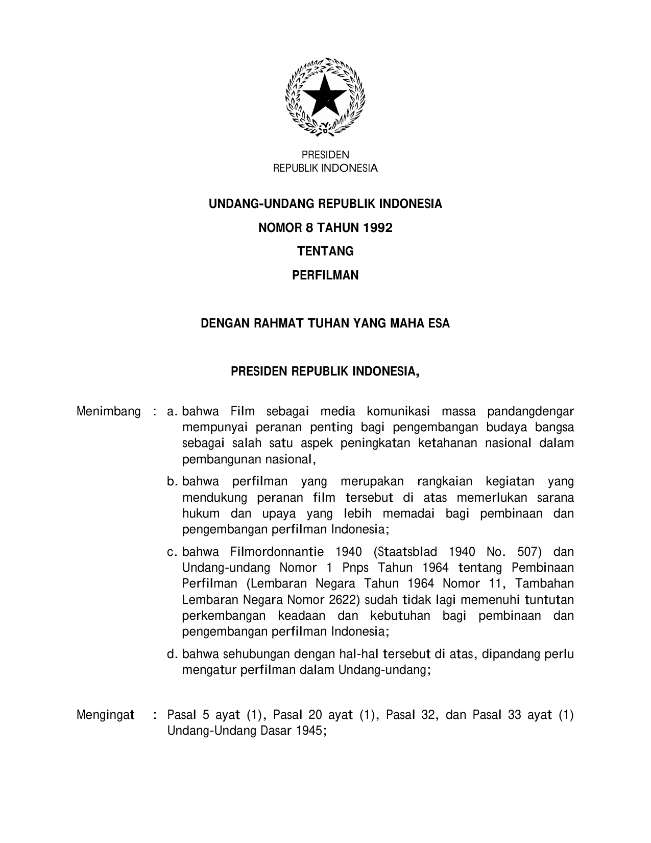 UU Nomor 8 Tahun 1992 | Undang-Undang Nomor 8 Tahun 1992 tentang PERFILMAN : PENGESAHAN AGREEMENT BETWEEN THE GOVERMENT OF THE REPUBLIC OF INDONESIA AND THE GOVERNMENT OF THE KINGDOM OF THAILAND ON ECONOMIC AND TECHNICAL COOPERATION33