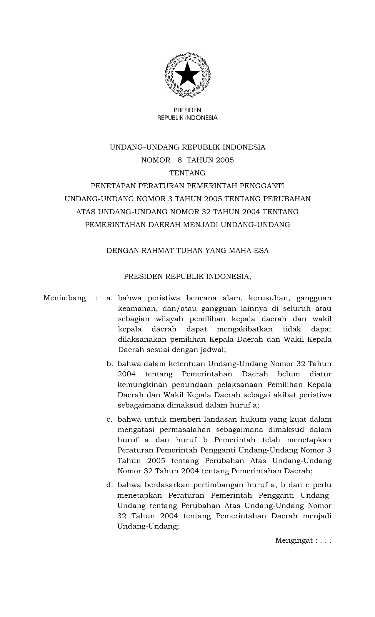 UU Nomor 8 Tahun 2005 | Undang-Undang Nomor 8 Tahun 2005 tentang PENETAPAN PERPU 3-2005 TENTANG PERUBAHAN UU 32-2004 TENTANG PEMERINTAHAN DAERAH MENJADI UU