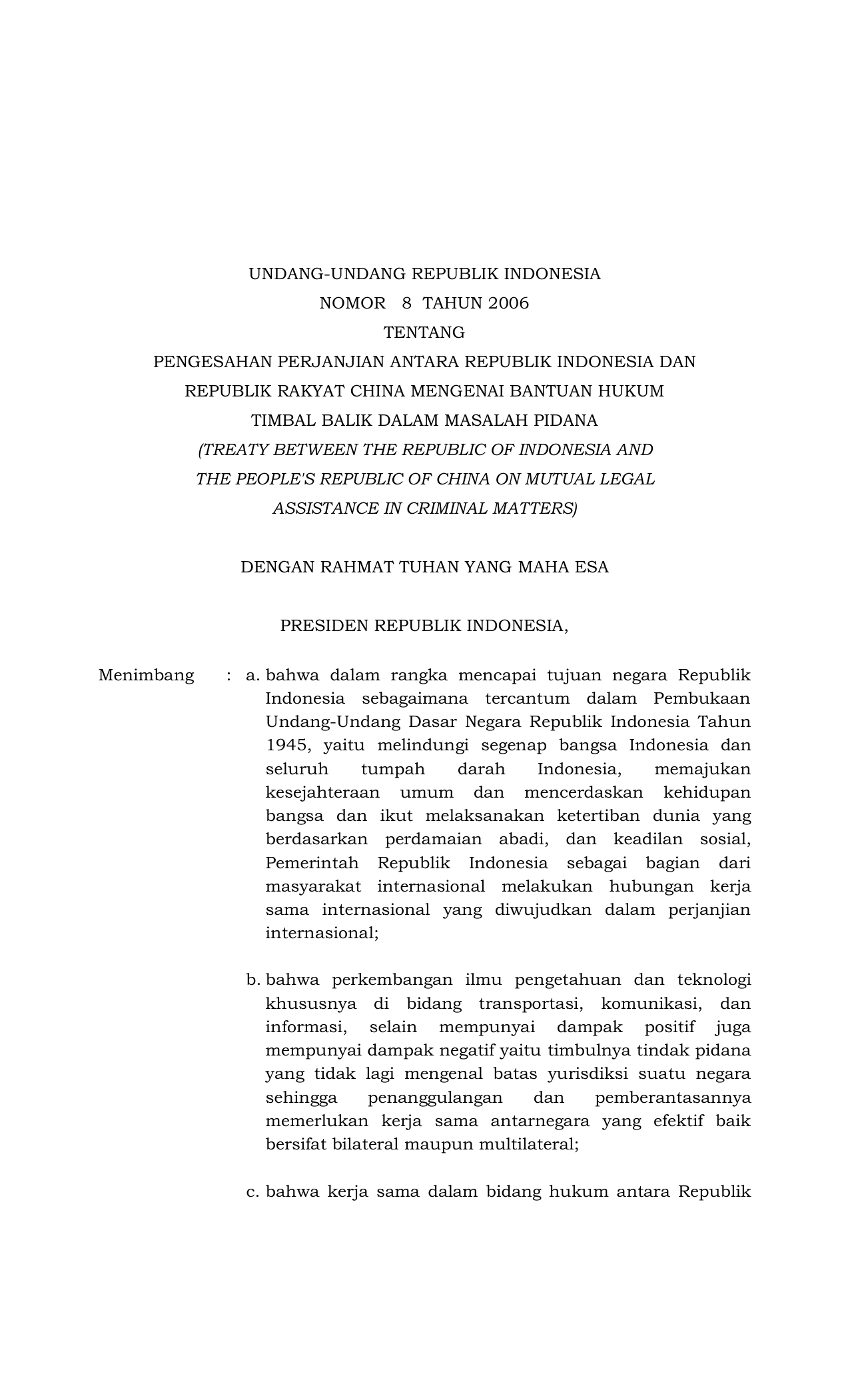 UU Nomor 8 Tahun 2006 | Undang-Undang Nomor 8 Tahun 2006 tentang PENGESAHAN PERJANJIAN ANTARA RI DAN REPUBLIK RAKYAT CHINA MENGENAI BANTUAN HUKUM TIMBAL BALIK DALAM MASALAH PIDANA (TREATY BETWEEN THE REPUBLIC OF INDONESIA AND THE PEOPLE�S REPUBLIC OF CHINA ON MUTUAL LEGAL ASSISTANCE IN CRIMINAL MATTERS)