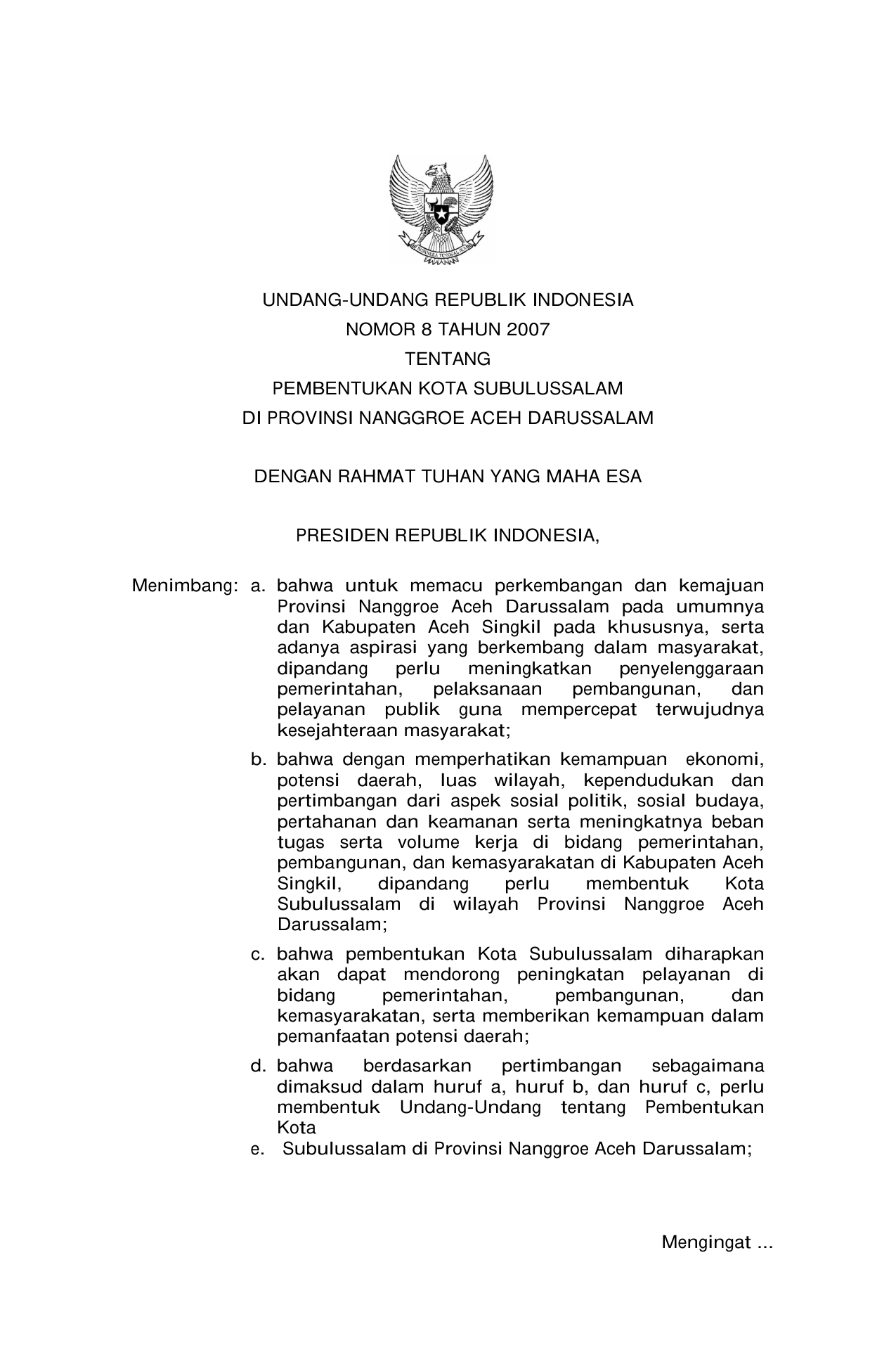 UU Nomor 8 Tahun 2007 | Undang-Undang Nomor 8 Tahun 2007 tentang PEMBENTUKAN KOTA SUBULUSSALAM DI PROVINSI NANGGROE ACEH DARUSSALAM