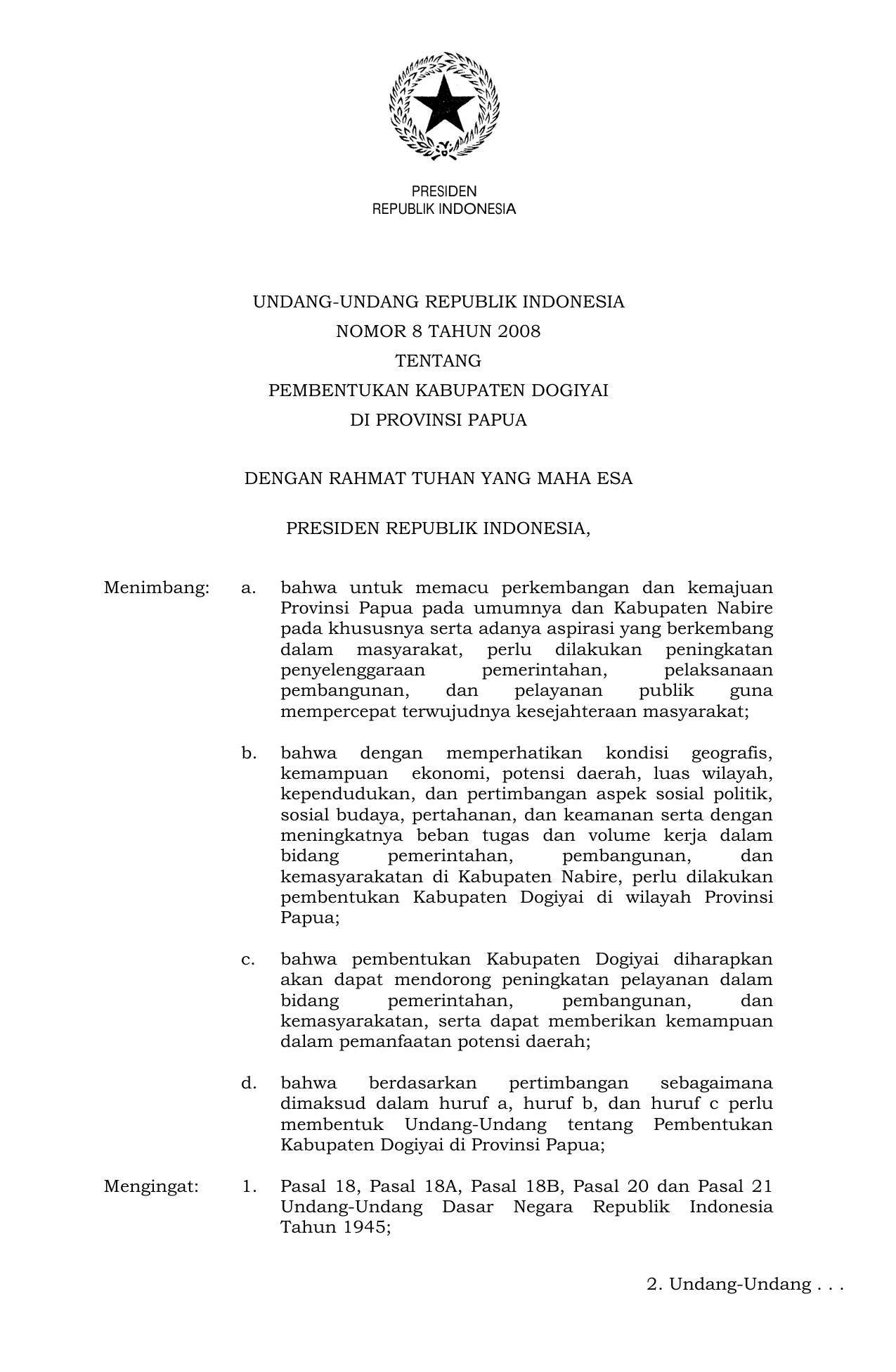 UU Nomor 8 Tahun 2008 | Undang-Undang Nomor 8 Tahun 2008 tentang PEMBENTUKAN KABUPATEN DOGIYAI DI PROVINSI PAPUA