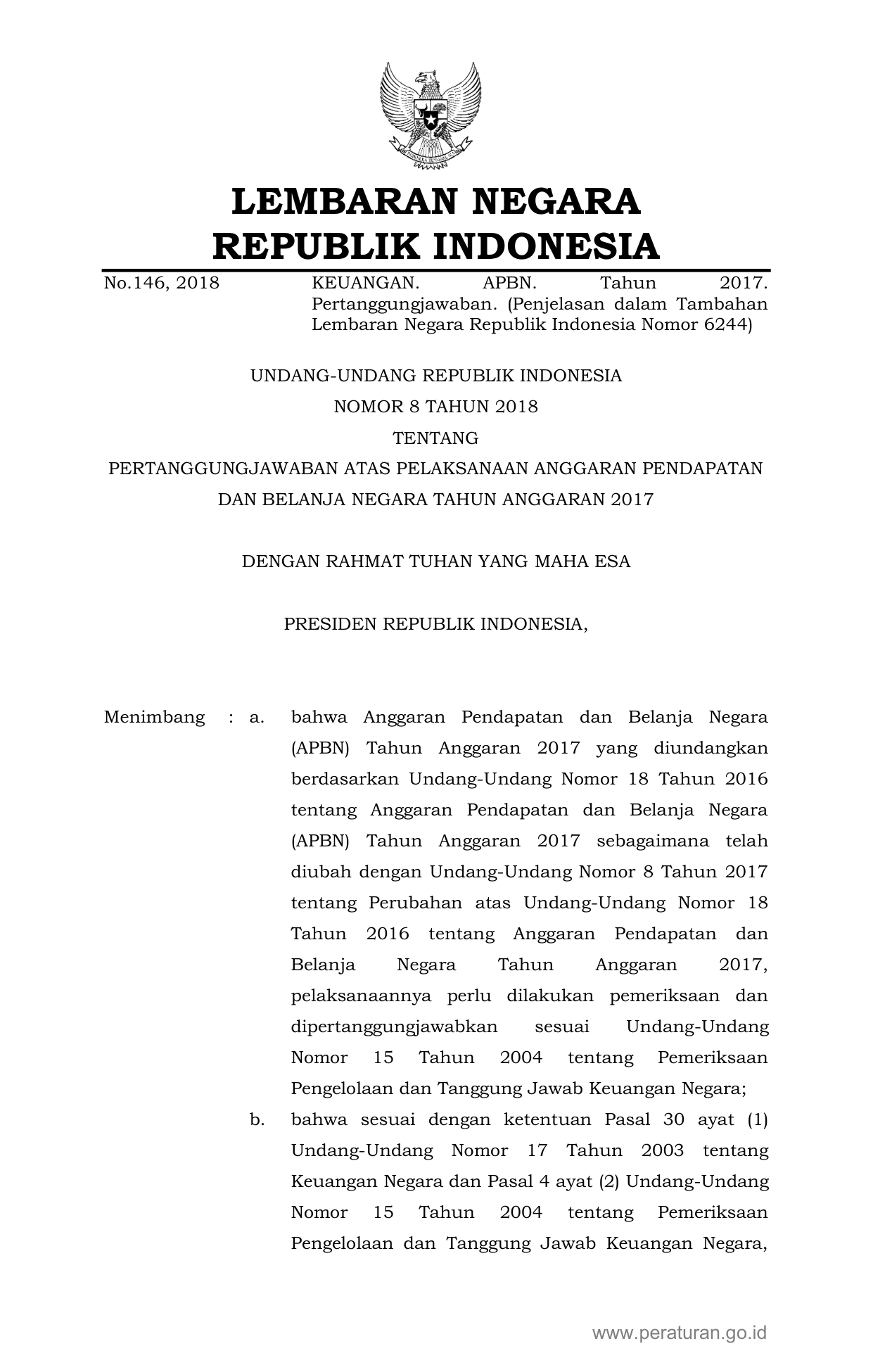 UU Nomor 8 Tahun 2018 | Undang-Undang Nomor 8 Tahun 2018 tentang Pertanggungjawaban Atas Pelaksanaan Anggaran Pendapatan dan Belanja Negara Tahun Anggaran 2017