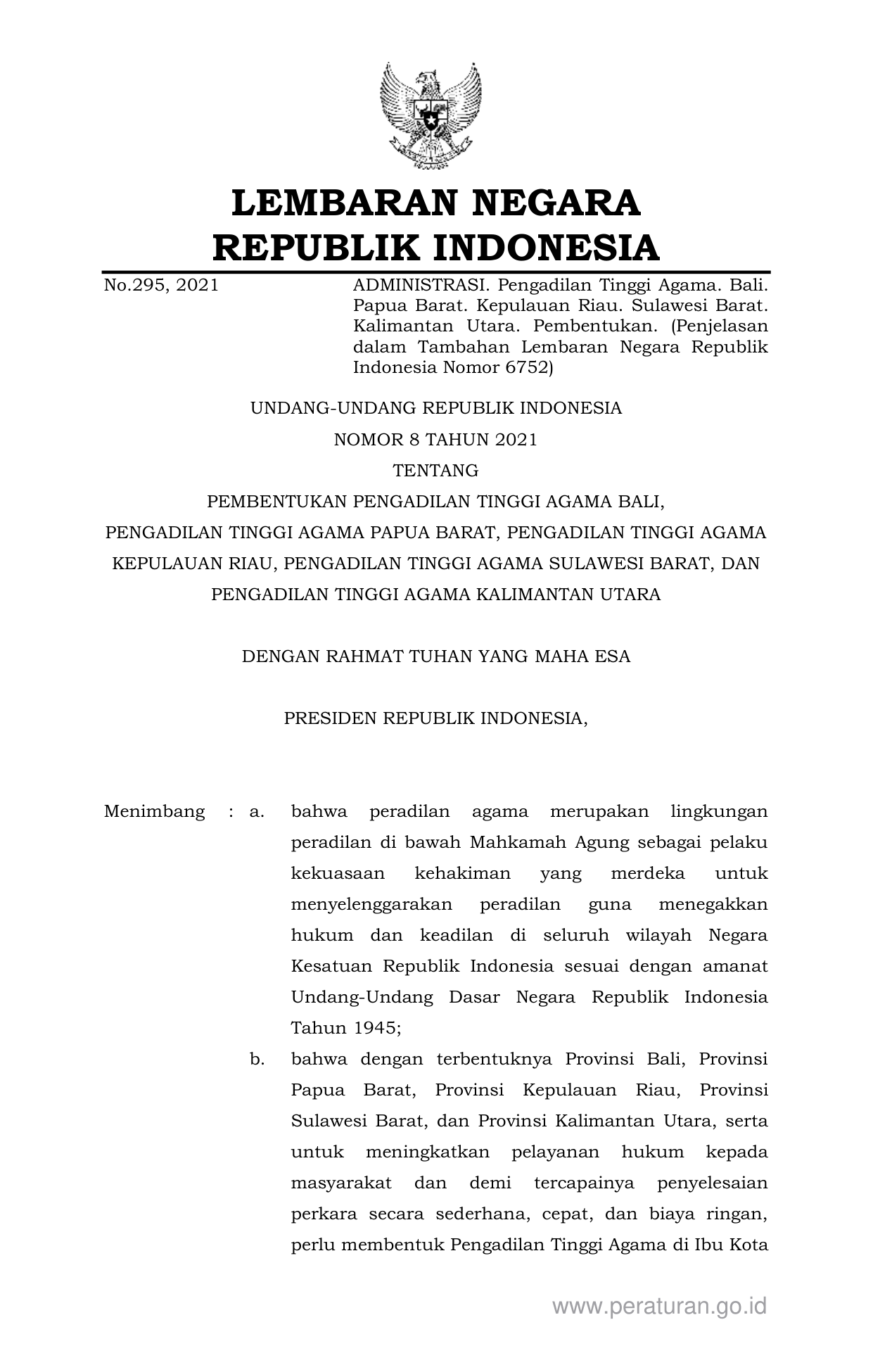 UU Nomor 8 Tahun 2021 | Undang-Undang Nomor 8 Tahun 2021 tentang PEMBENTUKAN PENGADILAN TINGGI AGAMA BALI, PENGADILAN TINGGI AGAMA PAPUA BARAT, PENGADILAN TINGGI AGAMA KEPULAUAN RIAU, PENGADILAN TINGGI AGAMA SULAWESI BARAT, DAN PENGADILAN TINGGI AGAMA KALIMANTAN UTARA