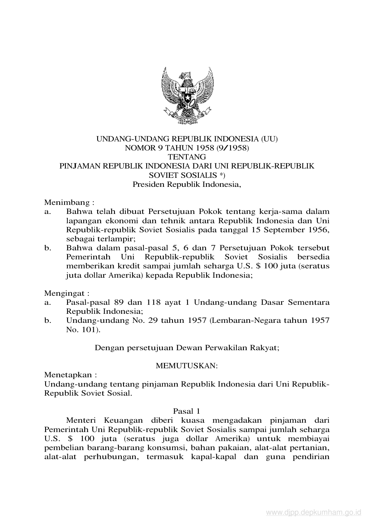 UU Nomor 9 Tahun 1958 | Undang-Undang Nomor 9 Tahun 1958 tentang PINJAMAN REPUBLIK INDONESIA DARI UNI REPUBLIK-REPUBLIK SOVIET SOSIALIS