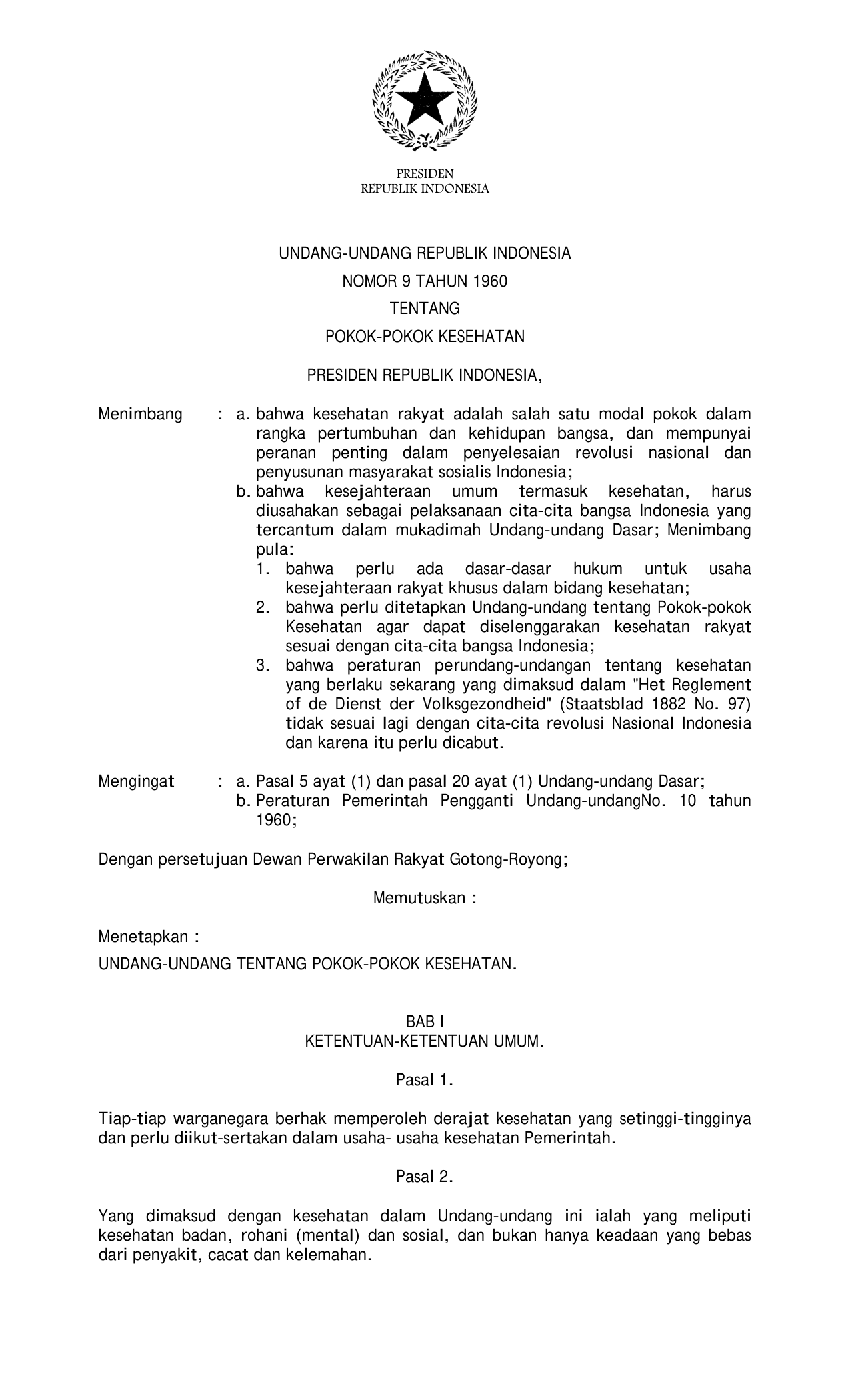 UU Nomor 9 Tahun 1960 | Undang-Undang Nomor 9 Tahun 1960 tentang POKOK-POKOK KESEHATAN