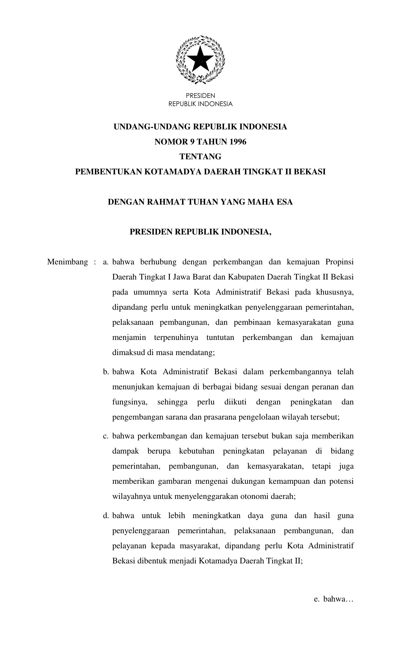UU Nomor 9 Tahun 1996 | Undang-Undang Nomor 9 Tahun 1996 tentang PEMBENTUKAN KOTAMADYA DAERAH TINGKAT II BEKASI