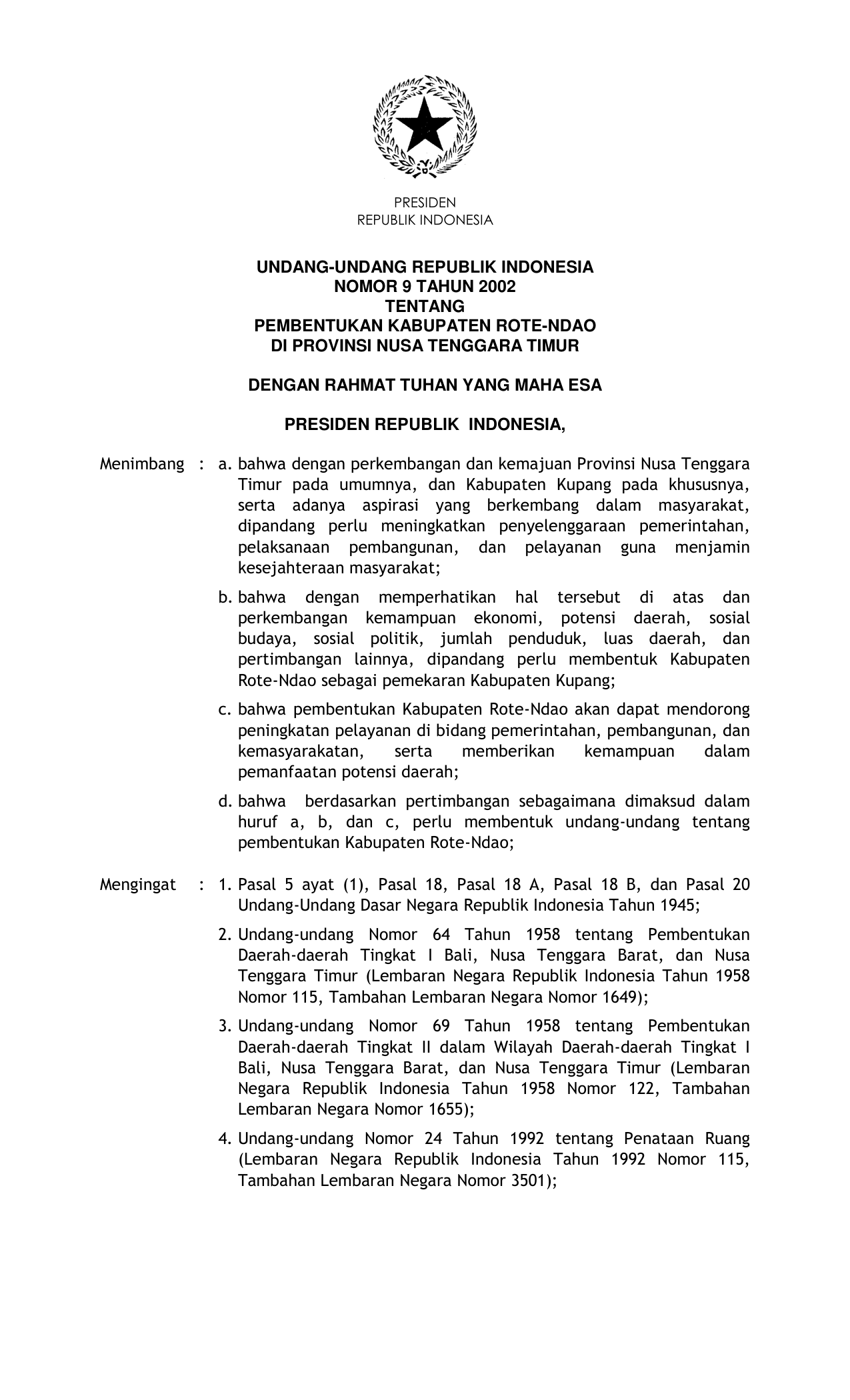 UU Nomor 9 Tahun 2002 | Undang-Undang Nomor 9 Tahun 2002 tentang PEMBENTUKAN KABUPATEN ROTE-NDAO DI PROVINSI NUSA TENGGARA TIMUR