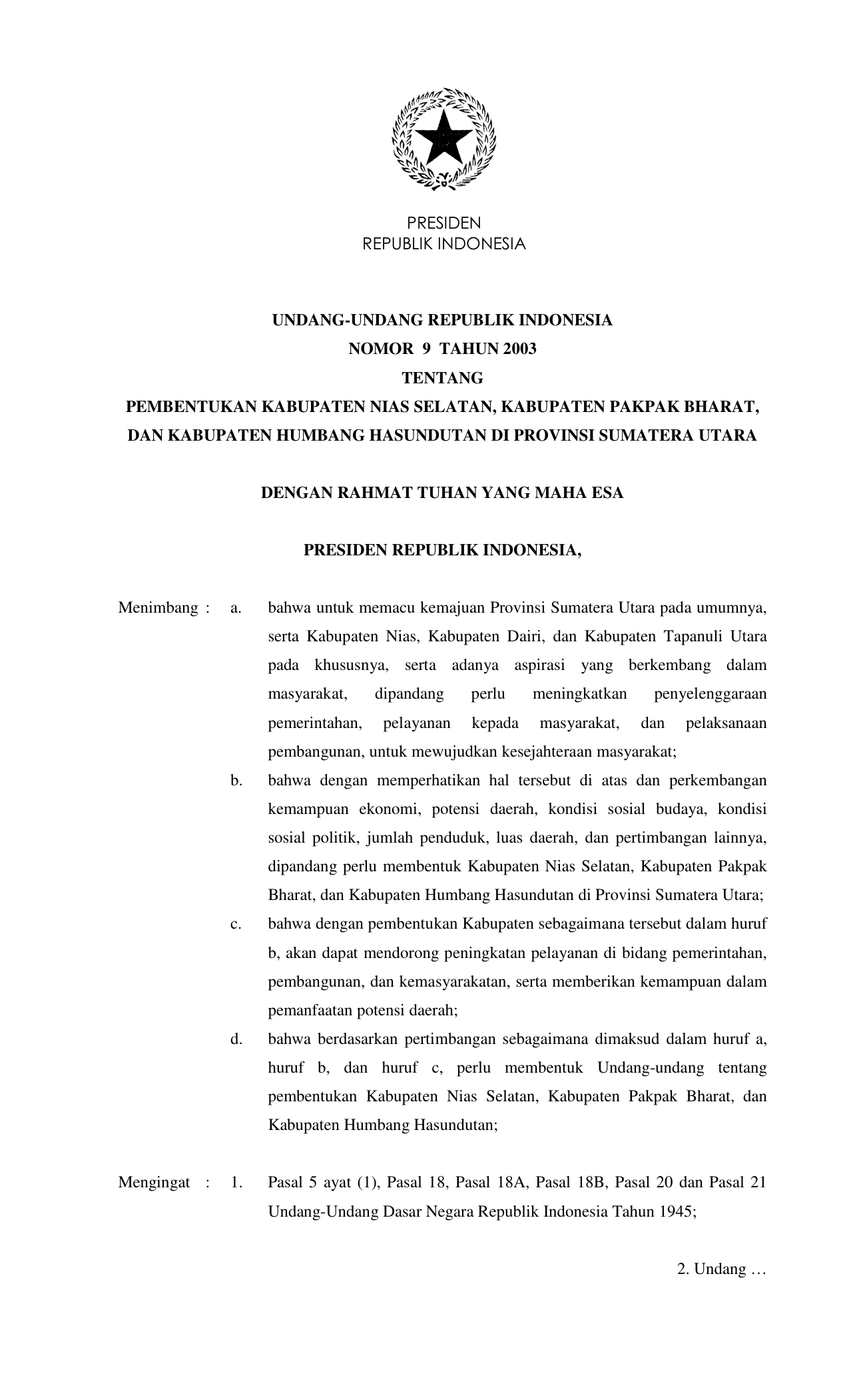 UU Nomor 9 Tahun 2003 | Undang-Undang Nomor 9 Tahun 2003 tentang PEMBENTUKAN KABUPATEN NIAS SELATAN, KABUPATEN PAKPAK BHARAT, DAN KABUPATEN HUMBANG HASUNDUTAN DI PROVINSI SUMATERA UTARA
