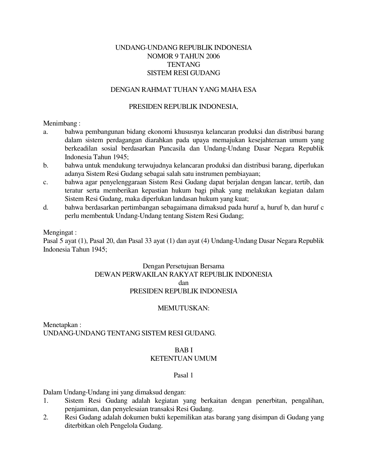 UU Nomor 9 Tahun 2006 | Undang-Undang Nomor 9 Tahun 2006 tentang SISTEM RESI GUDANG