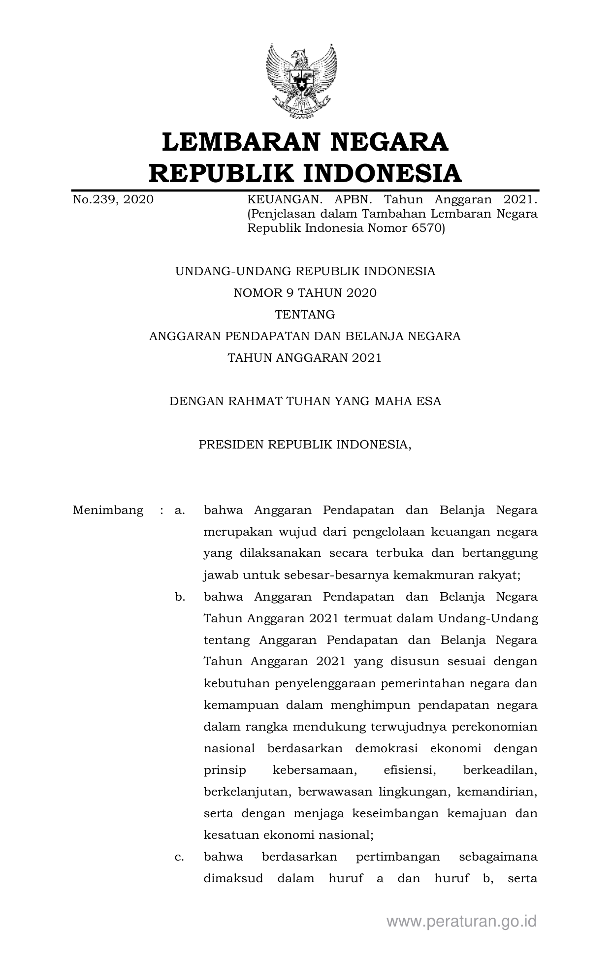 UU Nomor 9 Tahun 2020 | Undang-Undang Nomor 9 Tahun 2020 tentang ANGGARAN PENDAPATAN DAN BELANJA NEGARA TAHUN ANGGARAN 2021
