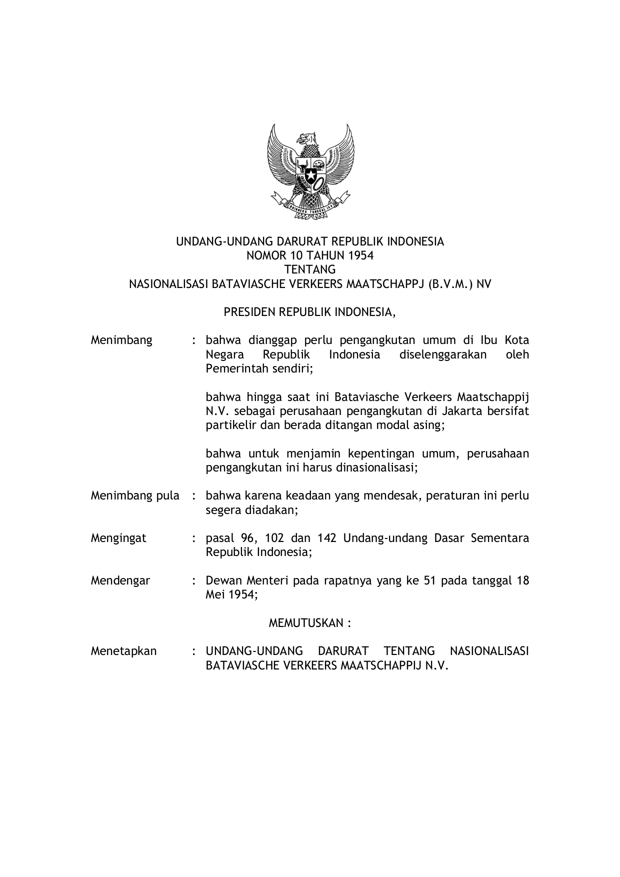 UUDRT Nomor 10 Tahun 1954 | Undang-Undang Darurat Nomor 10 Tahun 1954 tentang NASIONALISASI BATAVIASCHE VERKEERS MAATSCHAPPJ (B.V.M.) NV