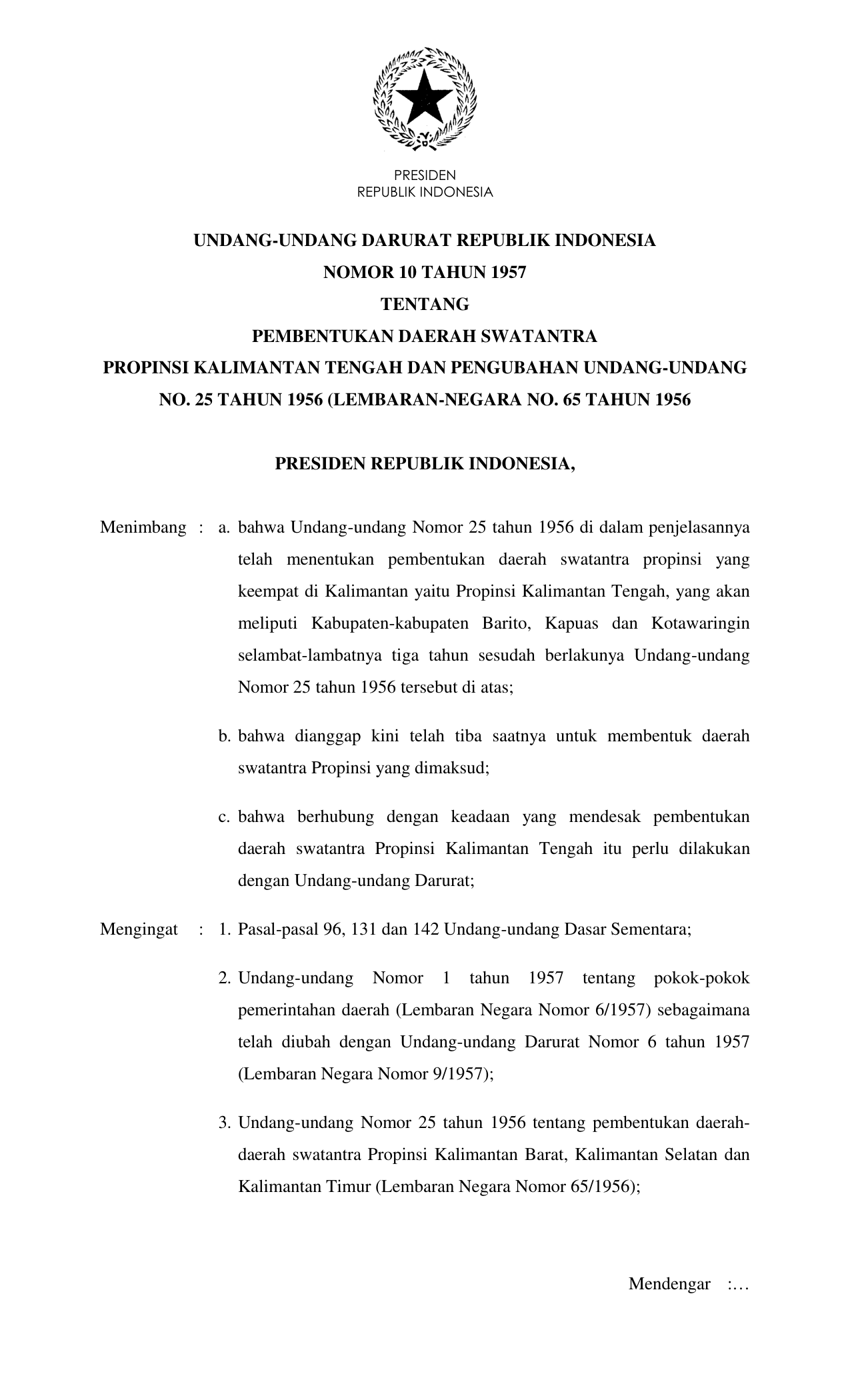 UUDRT Nomor 10 Tahun 1957 | Undang-Undang Darurat Nomor 10 Tahun 1957 tentang PEMBENTUKAN DAERAH SWATANTRA PROPINSI KALIMANTAN TENGAH DAN PENGUBAHAN UNDANG-UNDANG NO.25 TAHUN 1956