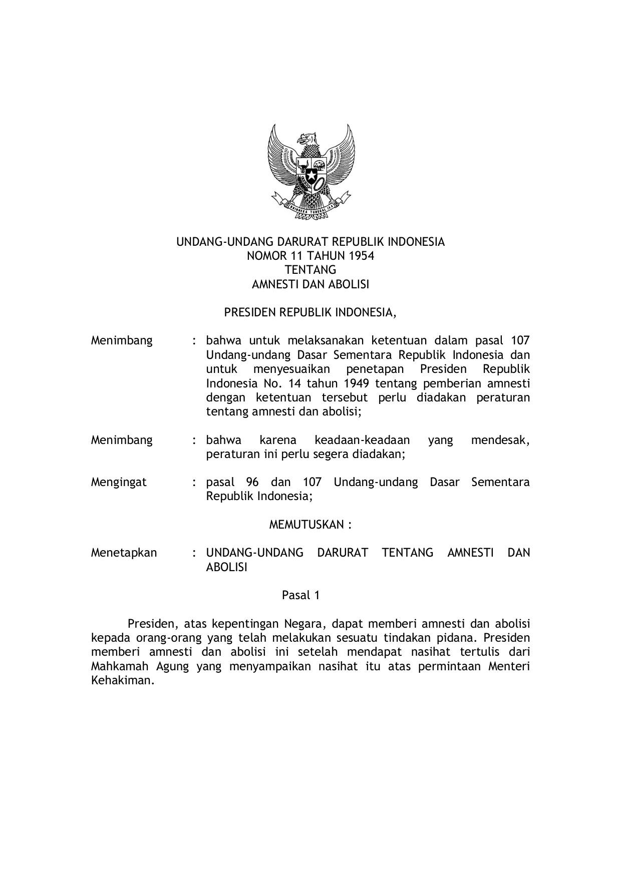 UUDRT Nomor 11 Tahun 1954 | Undang-Undang Darurat Nomor 11 Tahun 1954 tentang AMNESTI DAN ABOLISI