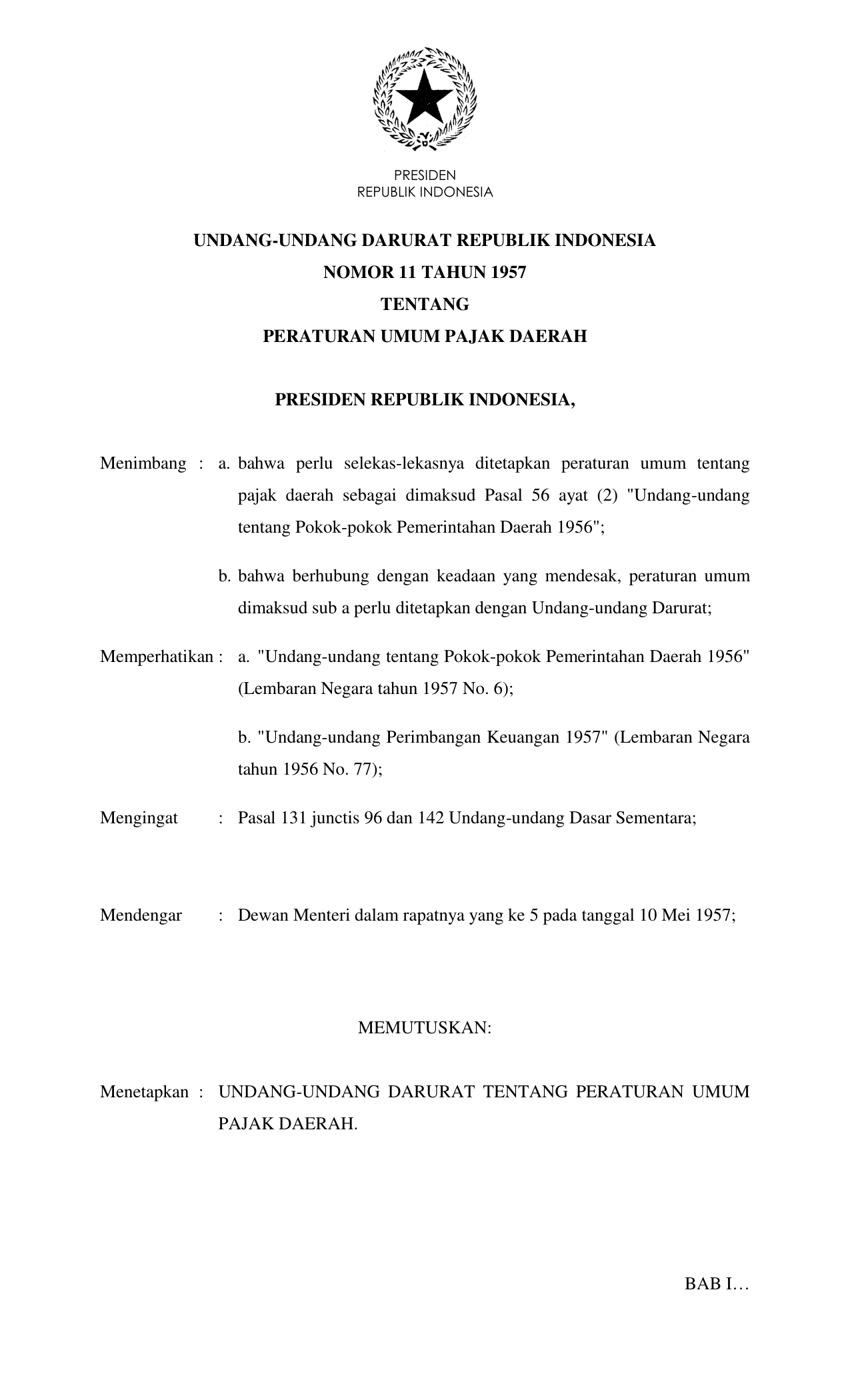 UUDRT Nomor 11 Tahun 1957 | Undang-Undang Darurat Nomor 11 Tahun 1957 tentang PERATURAN UMUM PAJAK DAERAH