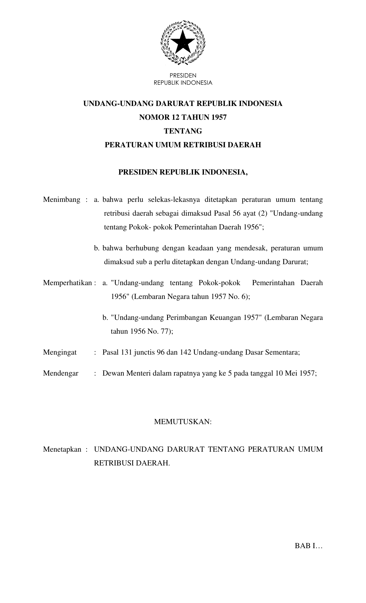 UUDRT Nomor 12 Tahun 1957 | Undang-Undang Darurat Nomor 12 Tahun 1957 tentang PERATURAN UMUM RETRIBUSI DAERAH