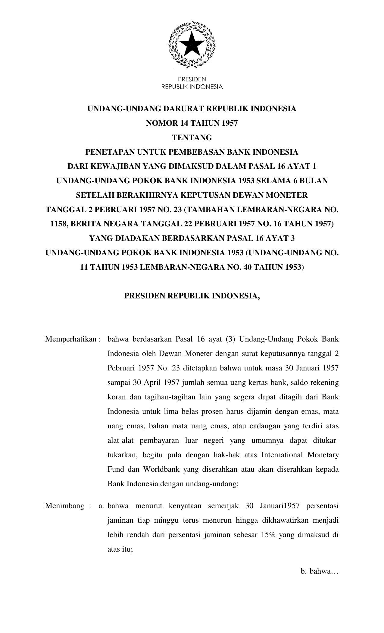 UUDRT Nomor 14 Tahun 1957 | Undang-Undang Darurat Nomor 14 Tahun 1957 tentang PENETAPAN UNTUK PEMBEBASAN BANK INDONESIA DARI KEWAJIBAN YANG DIMAKSUD DALAM PASAL 16 AYAT 1 UNDANG-UNDANG POKOK BANK INDONESIA 1953 SELAMA 6 BULAN SETELAH BERAKHIRNYA KEPUTUSAN DEWAN MONETER TANGGAL 2 PEBRUARI 1957 NO. 23 (TAMBAHAN LEMBARAN-NEGARA NO. 1158, BERITA NEGARA TANGGAL 22 PEBRUARI 1957 NO. 16 TAHUN 1957) YANG DIADAKAN BERDASARKAN PASAL 16 AYAT 3 UNDANG-UNDANG POKOK BANK INDONESIA 1953 (UNDANG-UNDANG NO. 11 TAHUN 1953 LEMBARAN-NEGARA NO. 40 TAHUN 1953)