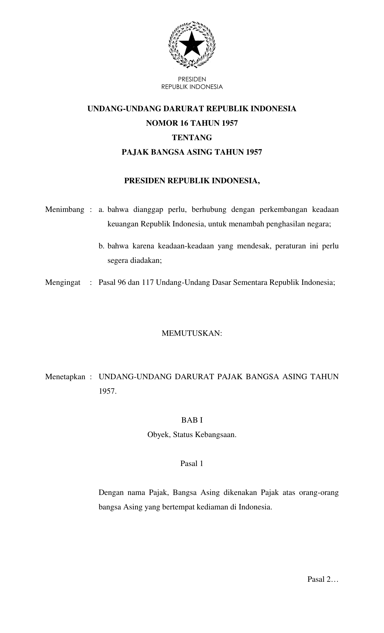 UUDRT Nomor 16 Tahun 1957 | Undang-Undang Darurat Nomor 16 Tahun 1957 tentang PAJAK BANGSA ASING TAHUN 1957