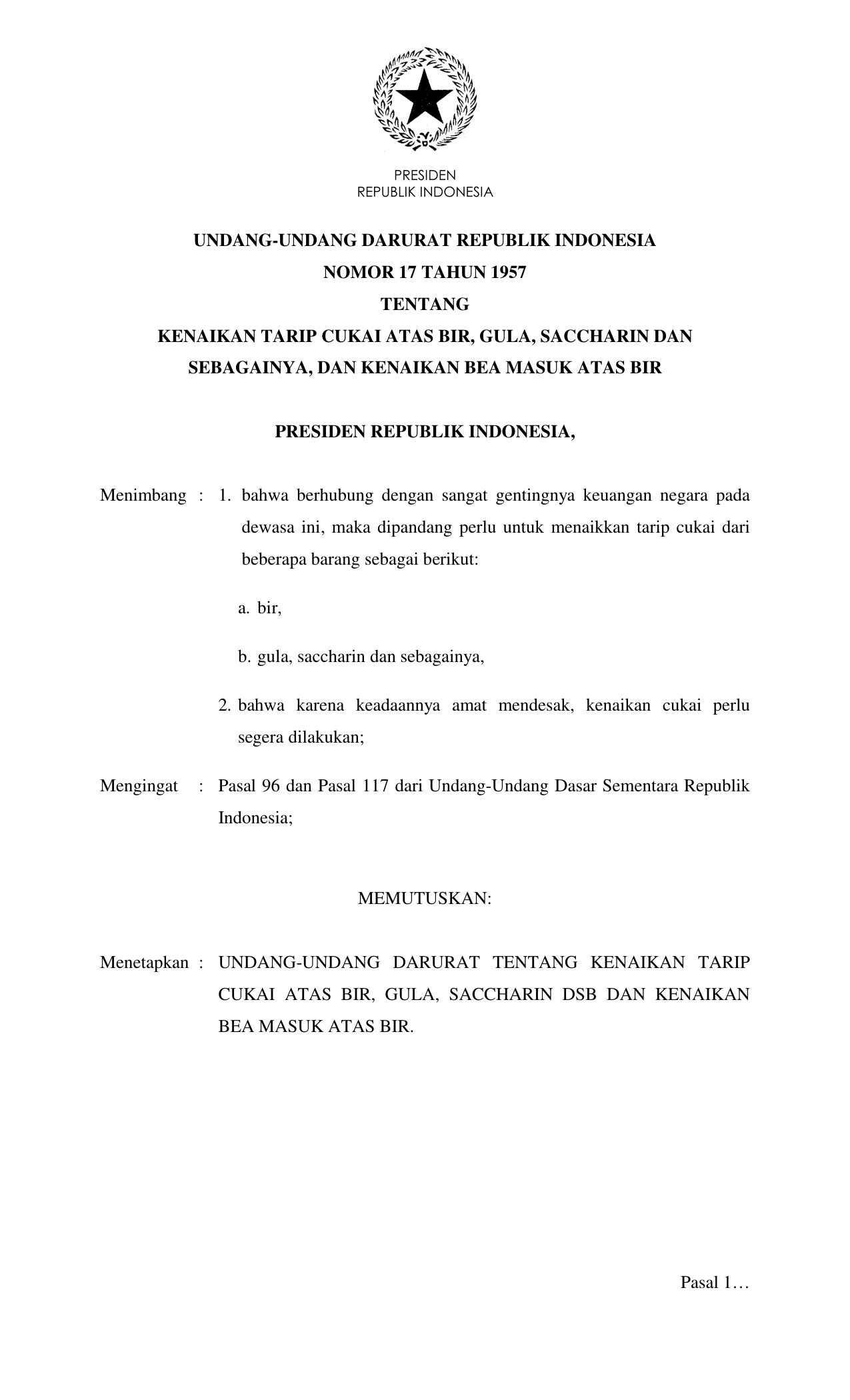UUDRT Nomor 17 Tahun 1957 | Undang-Undang Darurat Nomor 17 Tahun 1957 tentang KENAIKAN TARIP CUKAI ATAS BIR, GULA, SACCHARIN DAN SEBAGAINYA, DAN KENAIKAN BEA MASUK ATAS BIR