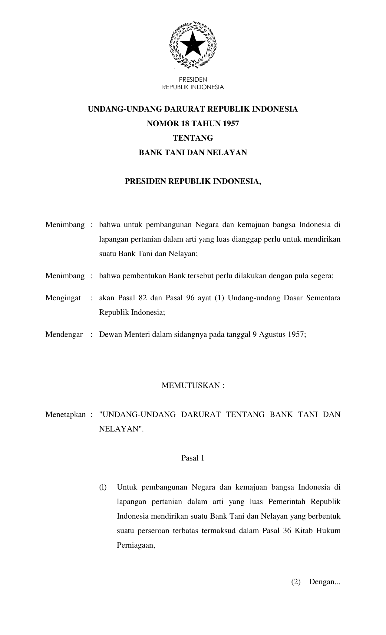 UUDRT Nomor 18 Tahun 1957 | Undang-Undang Darurat Nomor 18 Tahun 1957 tentang BANK TANI DAN NELAYAN