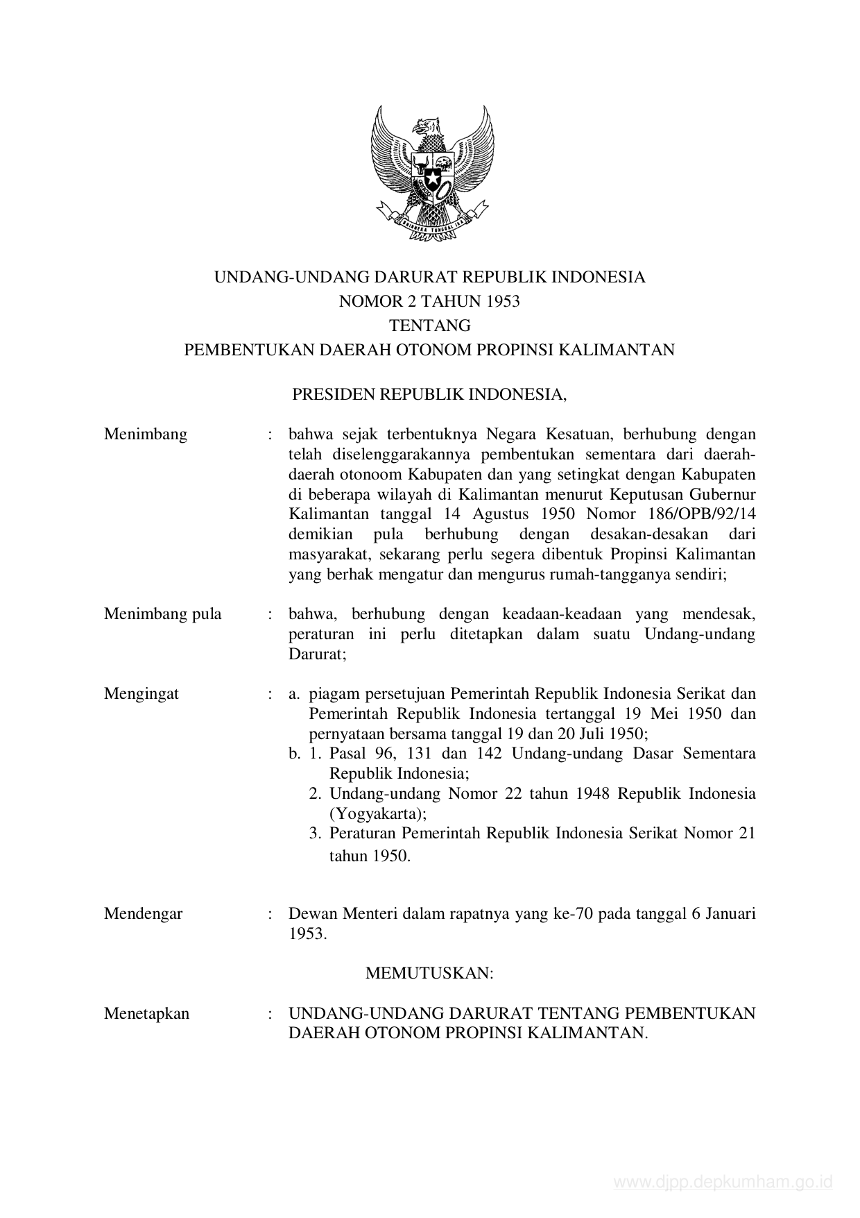 UUDRT Nomor 2 Tahun 1953 | Undang-Undang Darurat Nomor 2 Tahun 1953 tentang PEMBENTUKAN DAERAH OTONOM PROPINSI KALIMANTAN