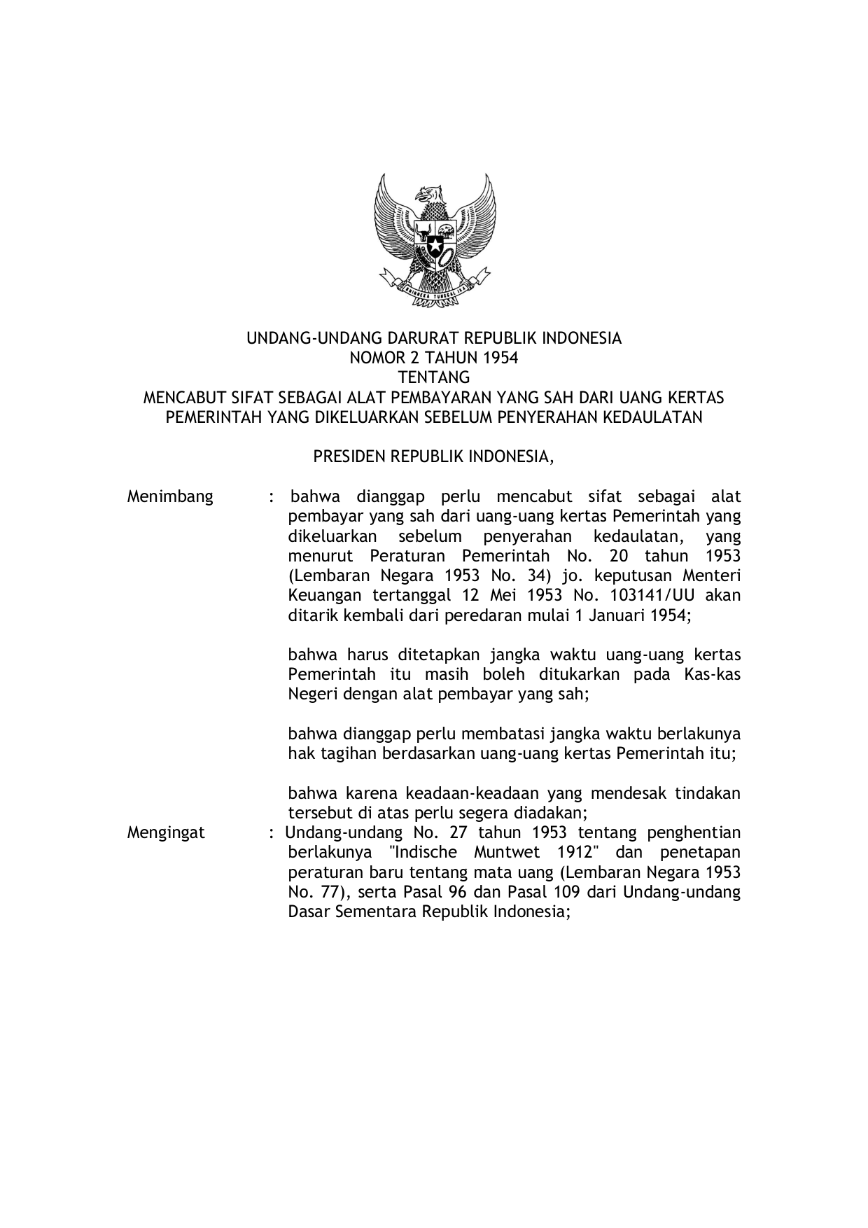 UUDRT Nomor 2 Tahun 1954 | Undang-Undang Darurat Nomor 2 Tahun 1954 tentang MENCABUT SIFAT SEBAGAI ALAT PEMBAYARAN YANG SAH DARI UANG KERTAS PEMERINTAH YANG DIKELUARKAN SEBELUM PENYERAHAN KEDAULATAN