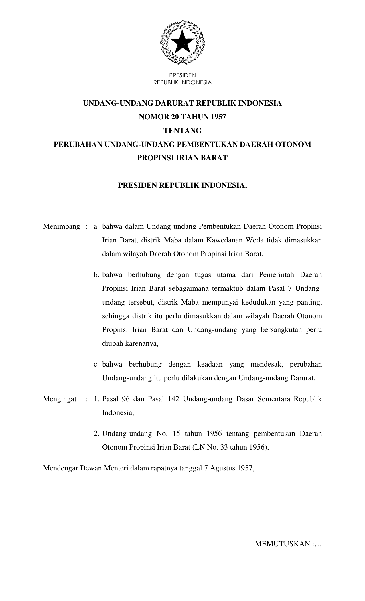 UUDRT Nomor 20 Tahun 1957 | Undang-Undang Darurat Nomor 20 Tahun 1957 tentang PERUBAHAN UNDANG-UNDANG PEMBENTUKAN DAERAH OTONOM PROPINSI IRIAN BARAT