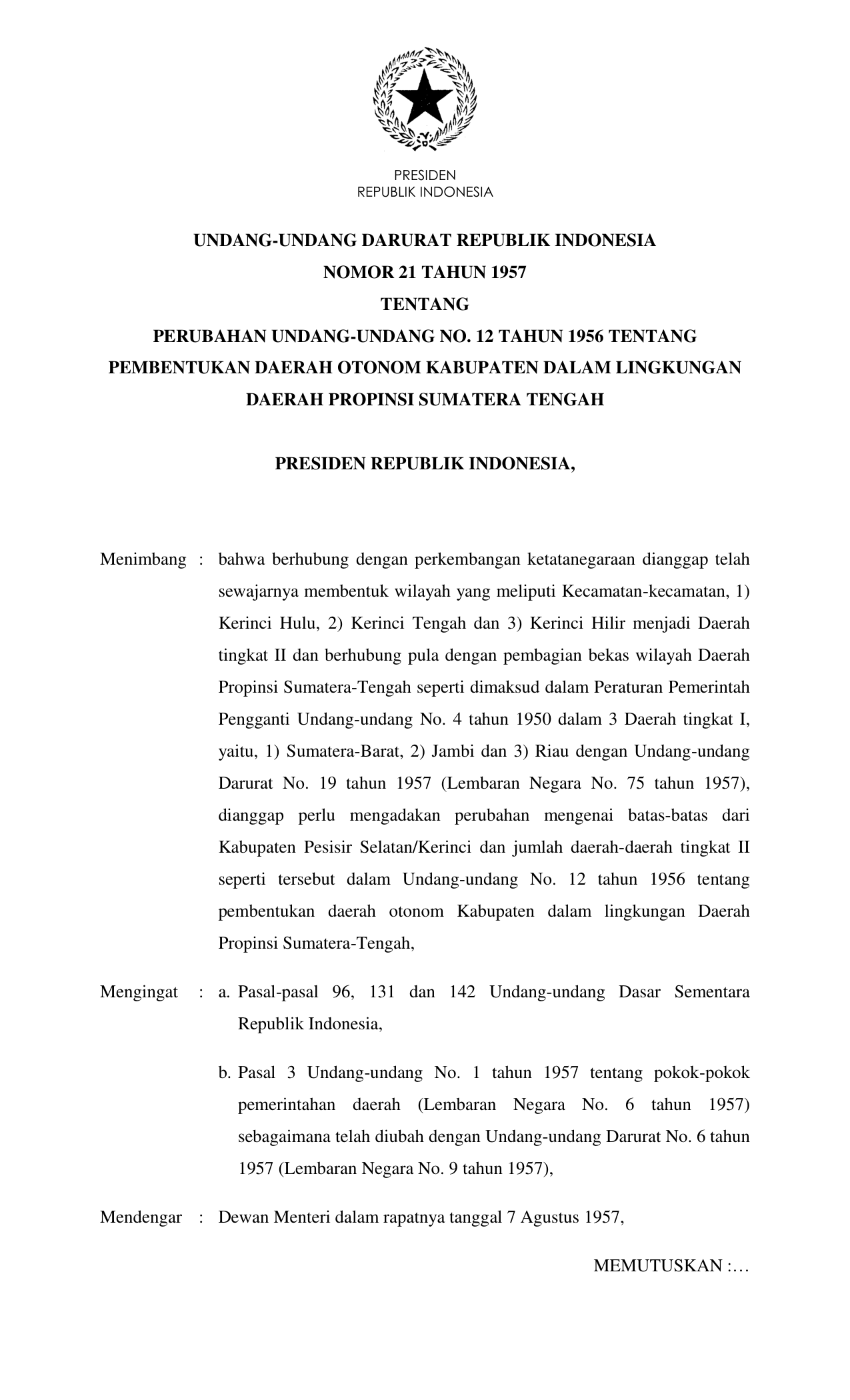 UUDRT Nomor 21 Tahun 1957 | Undang-Undang Darurat Nomor 21 Tahun 1957 tentang PERUBAHAN UNDANG-UNDANG NO. 12 TAHUN 1956 TENTANG PEMBENTUKAN DAERAH OTONOM KABUPATEN DALAM LINGKUNGAN DAERAH PROPINSI SUMATERA TENGAH