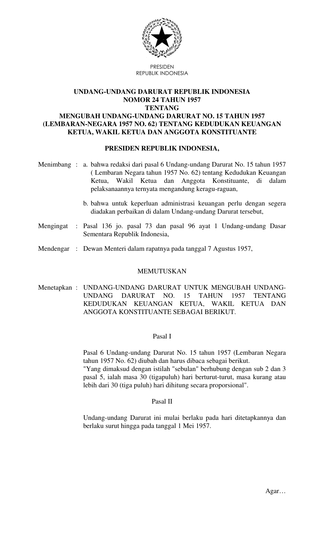 UUDRT Nomor 24 Tahun 1957 | Undang-Undang Darurat Nomor 24 Tahun 1957 tentang MENGUBAH UNDANG-UNDANG DARURAT NO. 15 TAHUN 1957 (LEMBARAN-NEGARA 1957 NO. 62) TENTANG KEDUDUKAN KEUANGAN KETUA, WAKIL KETUA DAN ANGGOTA KONSTITUANTE