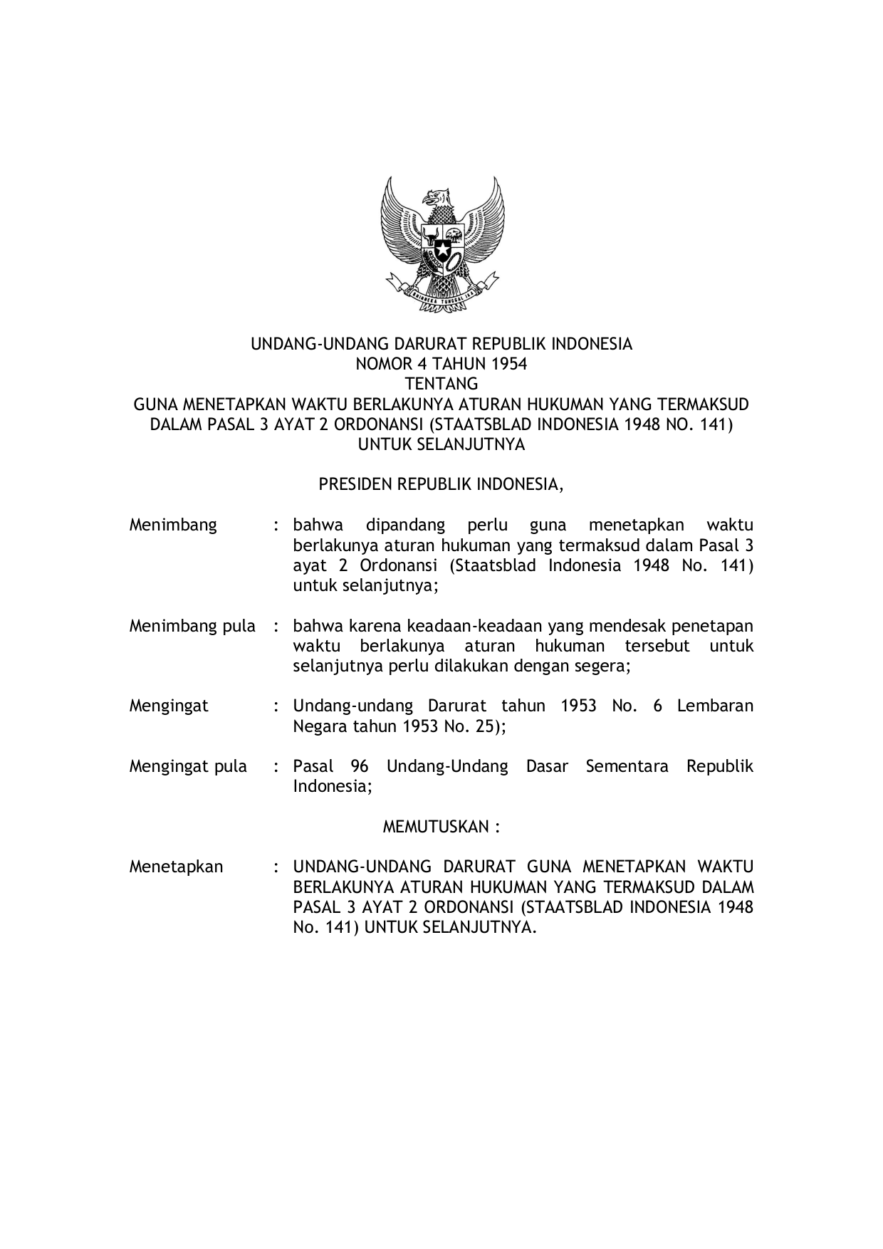 UUDRT Nomor 4 Tahun 1954 | Undang-Undang Darurat Nomor 4 Tahun 1954 tentang GUNA MENETAPKAN WAKTU BERLAKUNYA ATURAN HUKUMAN YANG TERMAKSUD DALAM PASAL 3 AYAT 2 ORDONANSI (STAATSBLAD INDONESIA 1948 NO. 141) UNTUK SELANJUTNYA