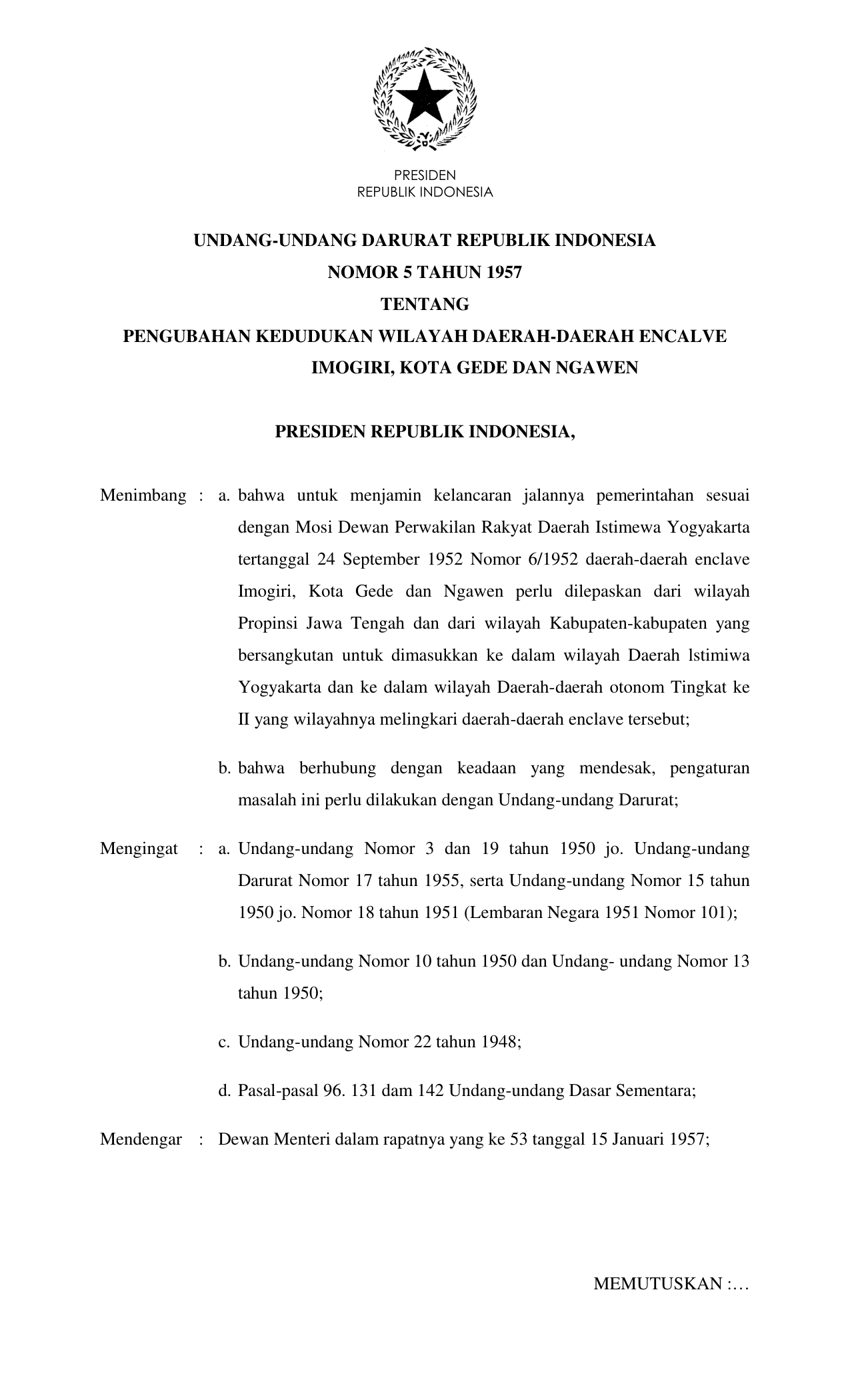 UUDRT Nomor 5 Tahun 1957 | Undang-Undang Darurat Nomor 5 Tahun 1957 tentang PENGUBAHAN KEDUDUKAN WILAYAH DAERAH-DAERAH ENCALVE IMOGIRI, KOTA GEDE DAN NGAWEN
