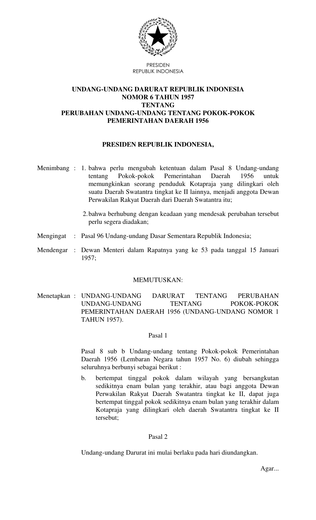UUDRT Nomor 6 Tahun 1957 | Undang-Undang Darurat Nomor 6 Tahun 1957 tentang PERUBAHAN UNDANG-UNDANG NOMOR 1 TAHUN 1951 TENTANG POKOK-POKOK PEMERINTAHAN DAERAH 1956 (UNDANG-UNDANG NOMOR 1 TAHUN 1957)
