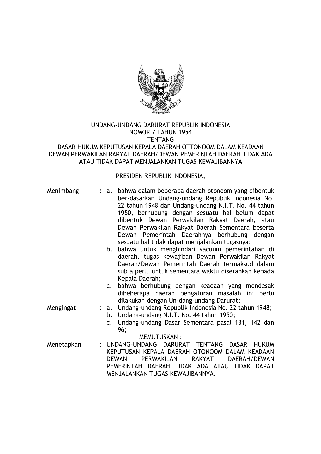 UUDRT Nomor 7 Tahun 1954 | Undang-Undang Darurat Nomor 7 Tahun 1954 tentang DASAR HUKUM KEPUTUSAN KEPALA DAERAH OTONOM DALAM KEADAAN DEWAN PERWAKILAN RAKYAT DAERAH/DEWAN PEMERINTAH DAERAH TIDAK ADA ATAU TIDAK DAPAT MENJALANKAN TUGAS KEWAJIBANNYA