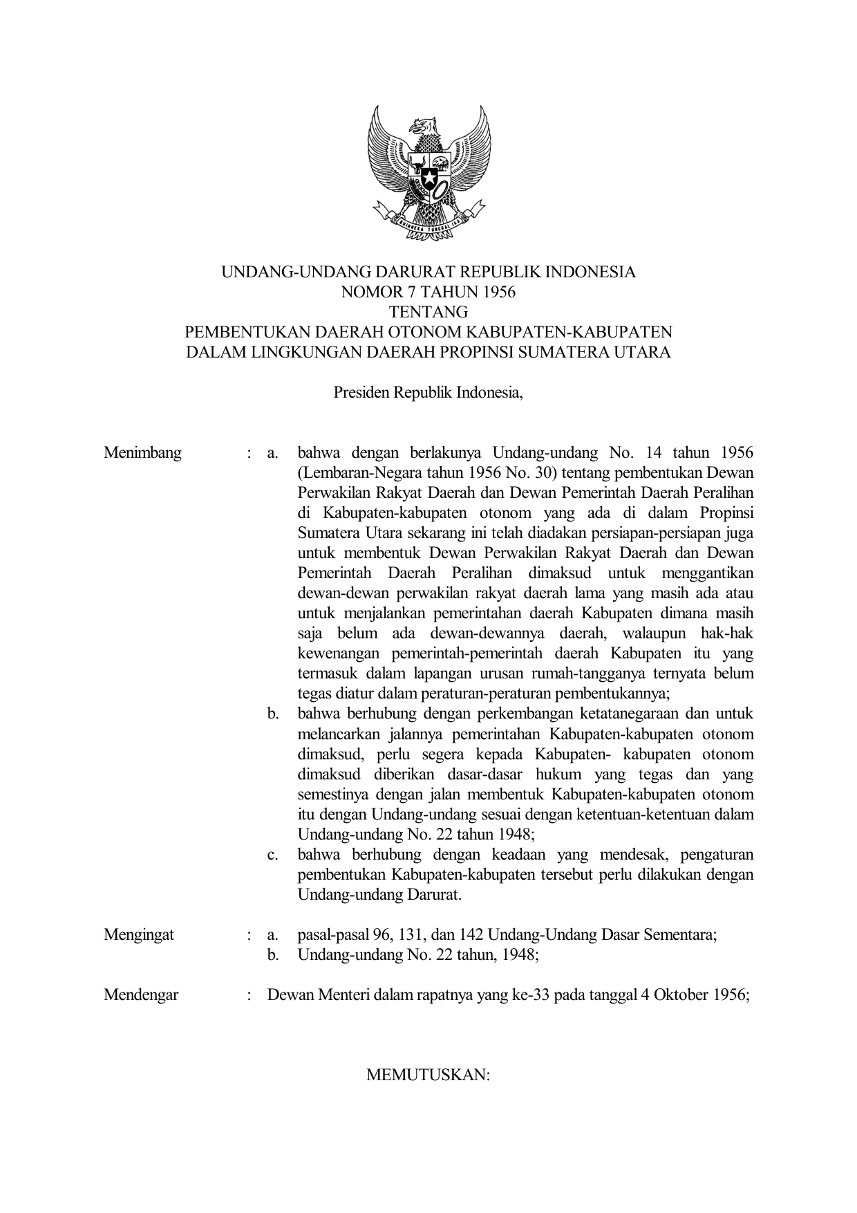 UUDRT Nomor 7 Tahun 1956 | Undang-Undang Darurat Nomor 7 Tahun 1956 tentang PEMBENTUKAN DAERAH OTONOM KABUPATEN-KABUPATEN DALAM LINGKUNGAN DAERAH PROPINSI SUMATERA UTARA