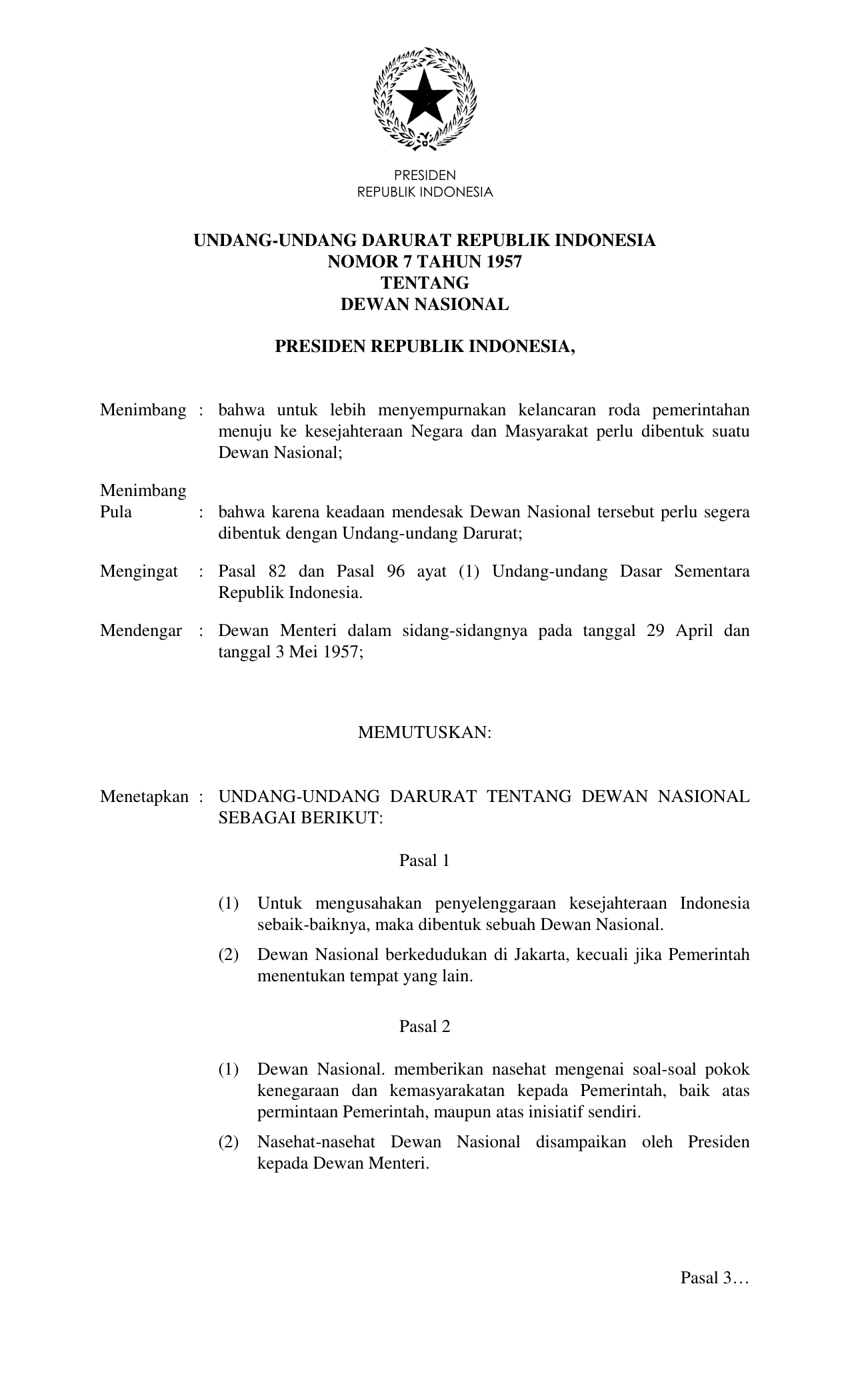 UUDRT Nomor 7 Tahun 1957 | Undang-Undang Darurat Nomor 7 Tahun 1957 tentang DEWAN NASIONAL