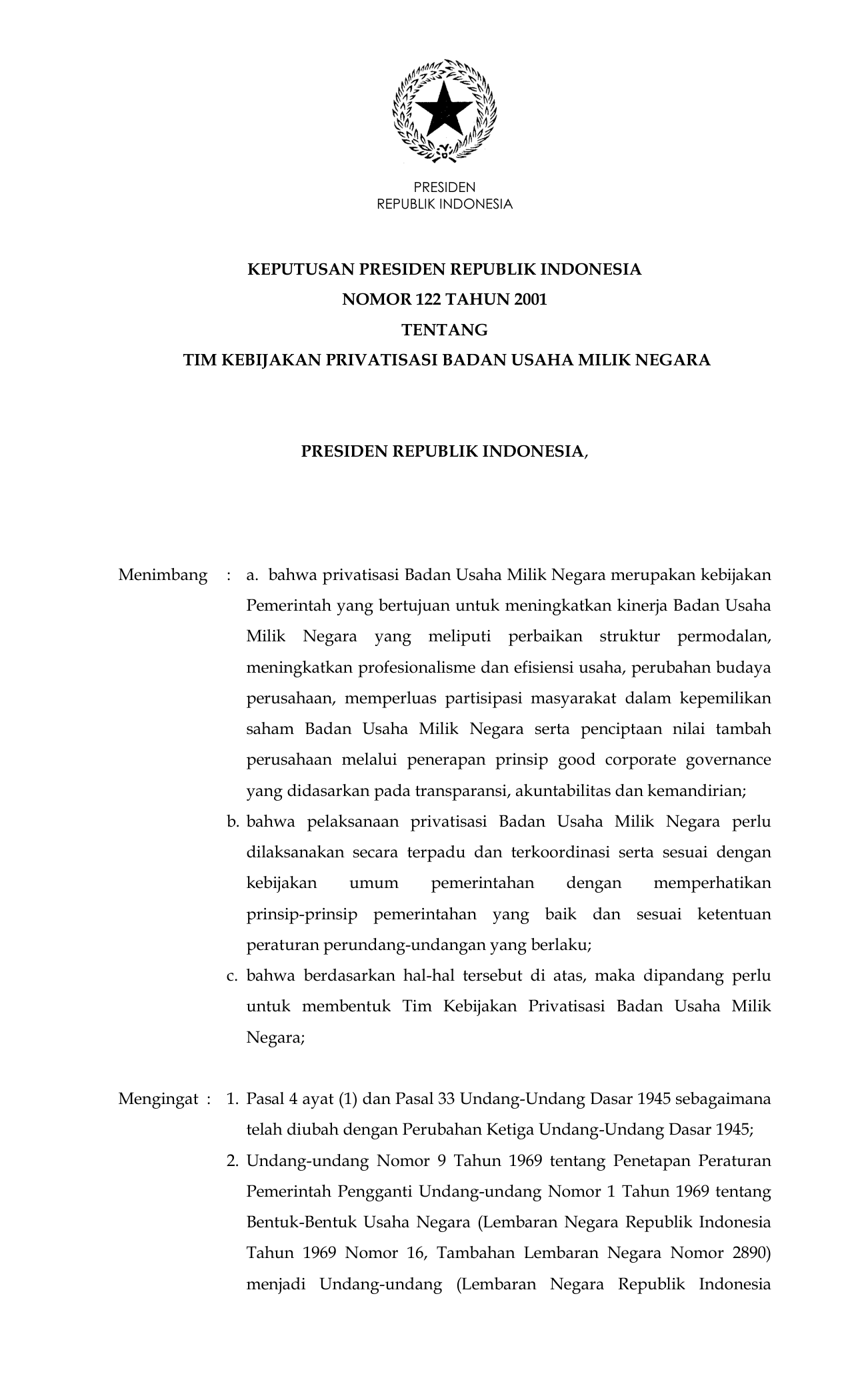 KEPPRES Nomor 122 Tahun 2001 | Keputusan Presiden Nomor 122 Tahun 2001 tentang TIM KEBIJAKAN PRIVATISASI BADAN USAHA MILIK NEGARA