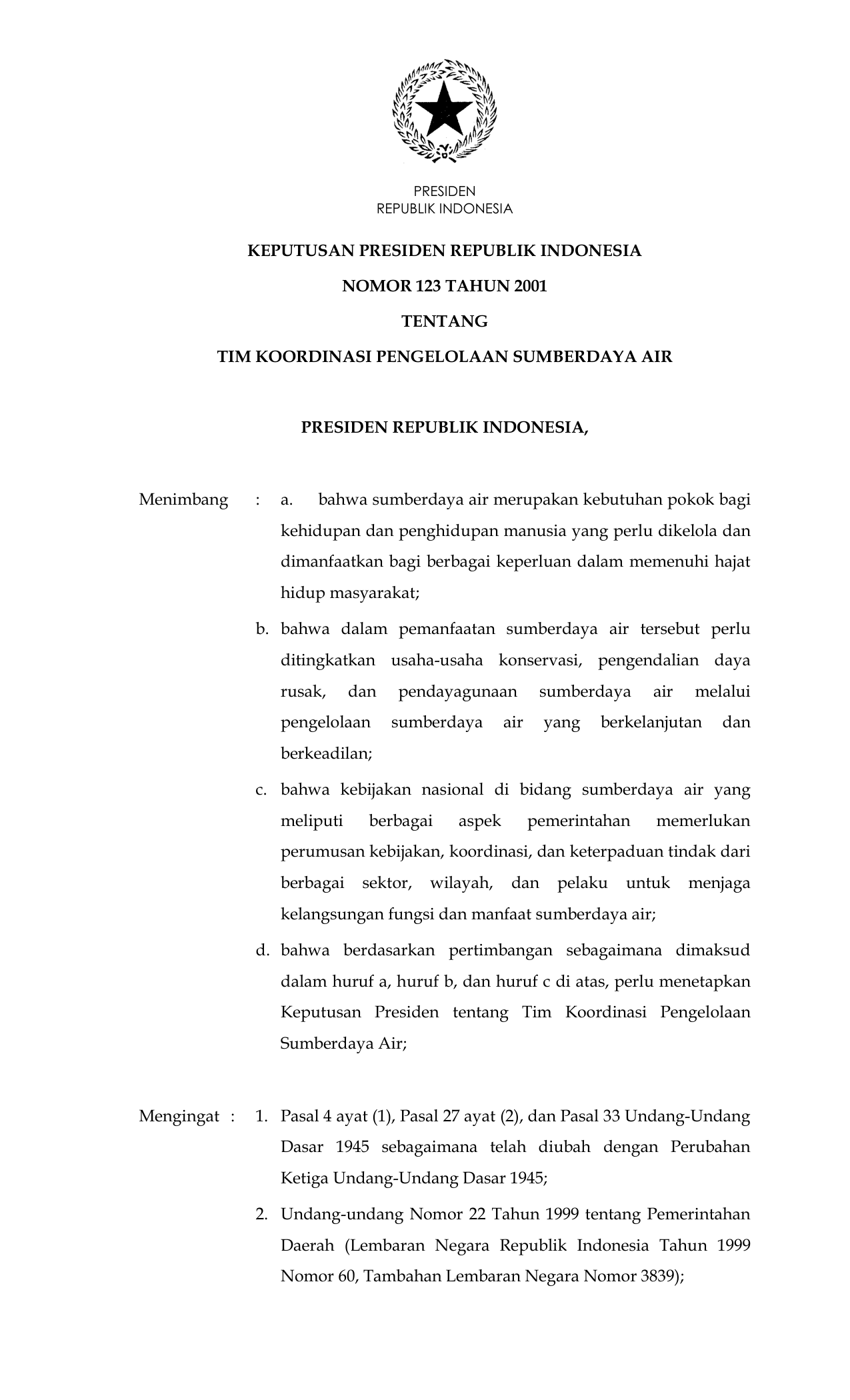 KEPPRES Nomor 123 Tahun 2001 | Keputusan Presiden Nomor 123 Tahun 2001 tentang TIM KOORDINASI PENGELOLAAN SUMBER DAYA AIR