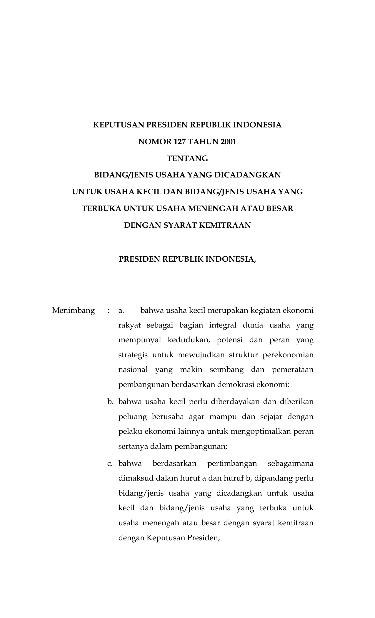 KEPPRES Nomor 127 Tahun 2001 | Keputusan Presiden Nomor 127 Tahun 2001 tentang BIDANG/JENIS USAHA YANG DICADANGKAN UNTUK USAHA KECIL DAN BIDANG/JENIS USAHA YANG TERBUKA UNTUK USAHA MENENGAH ATAU BESAR DENGAN SYARAT KEMITRAAN