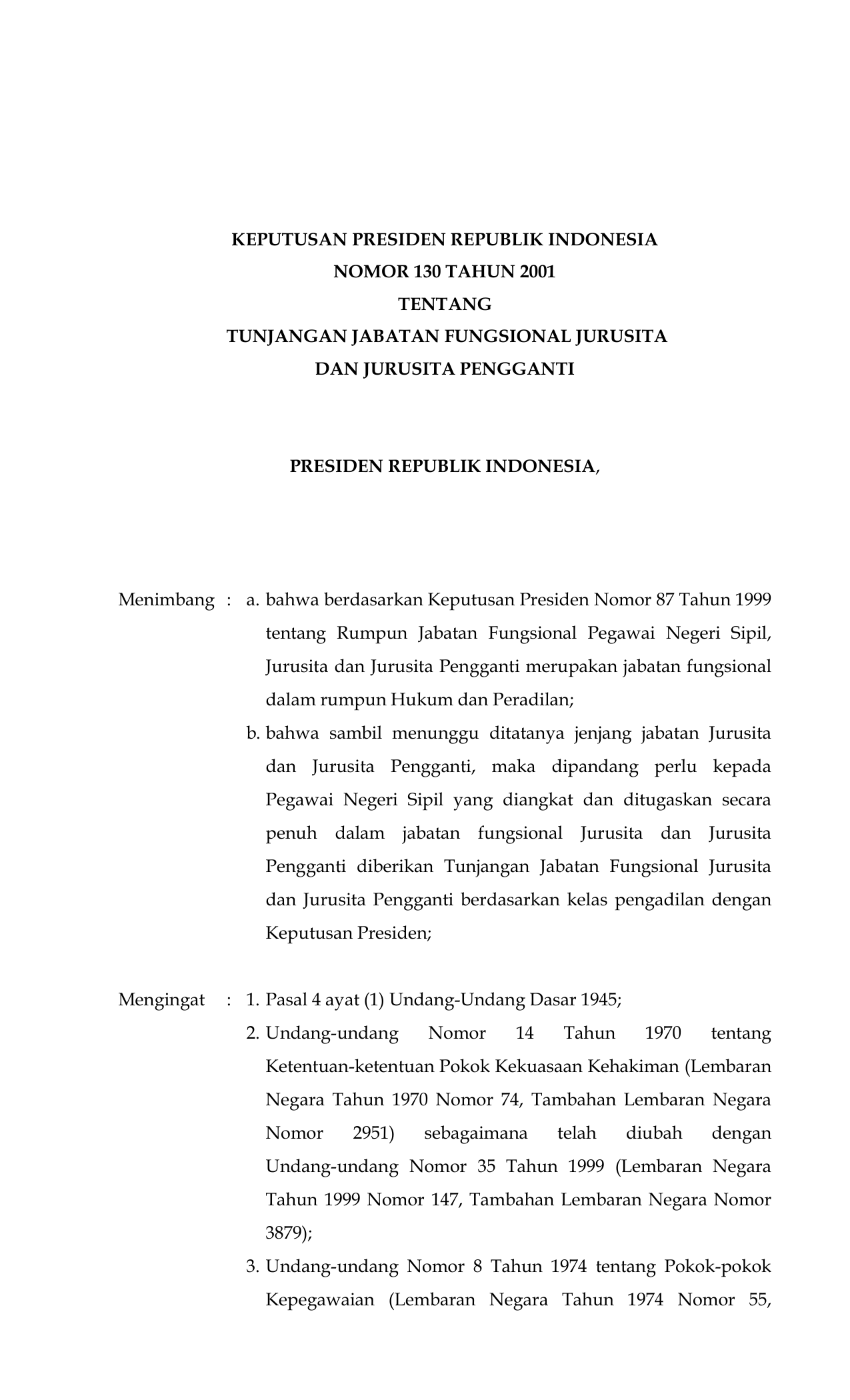 KEPPRES Nomor 130 Tahun 2001 | Keputusan Presiden Nomor 130 Tahun 2001 tentang TUNJANGAN JABATAN FUNGSIONAL JURUSITA, DAN JURUSITA PENGGANTI