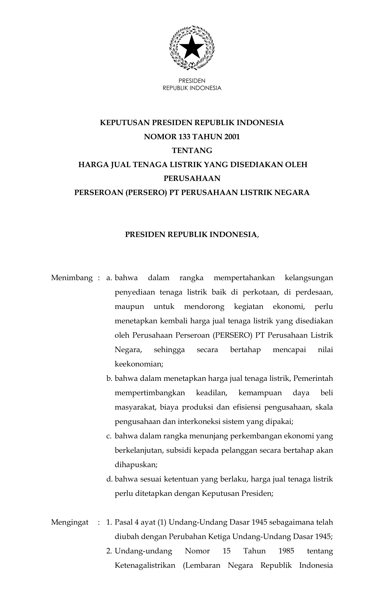 KEPPRES Nomor 133 Tahun 2001 | Keputusan Presiden Nomor 133 Tahun 2001 tentang HARGA JUAL TENAGA LISTRIK YANG DISEDIAKAN OLEH PERUSAHAAN PERSEROAN (PERSERO) PT PERUSAHAAN LISTRIK NEGARA