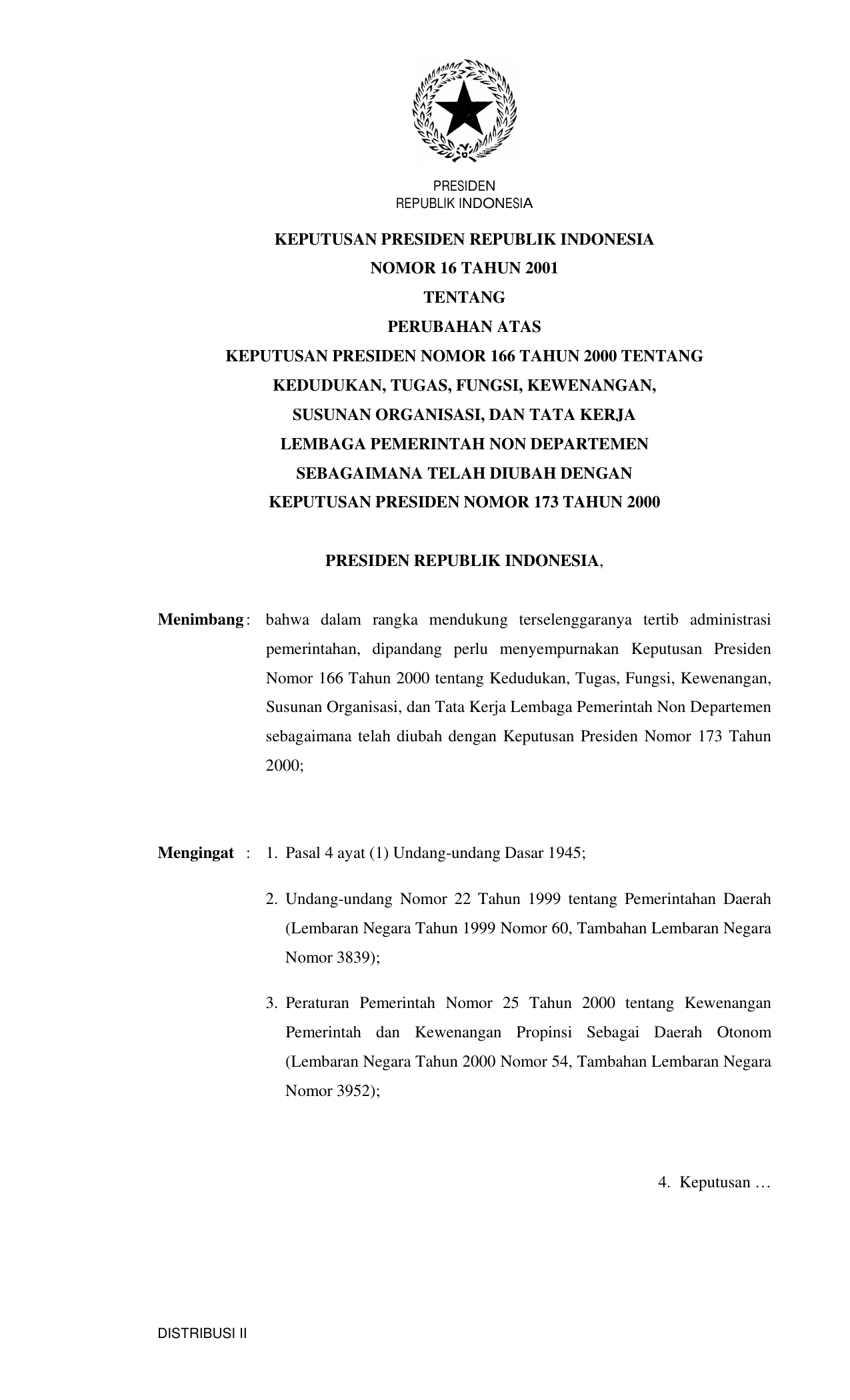 KEPPRES Nomor 16 Tahun 2001 | Keputusan Presiden Nomor 16 Tahun 2001 tentang PERUBAHAN KEPPRES 166-2000 TENTANG KEDUDUKAN, TUGAS, FUNGSI, KEWENANGAN, SUSUNAN ORGANISASI TATA KERJA LPND SEBAGAIMANA TELAH DIUBAH DENGAN KEPPRES 173-2000