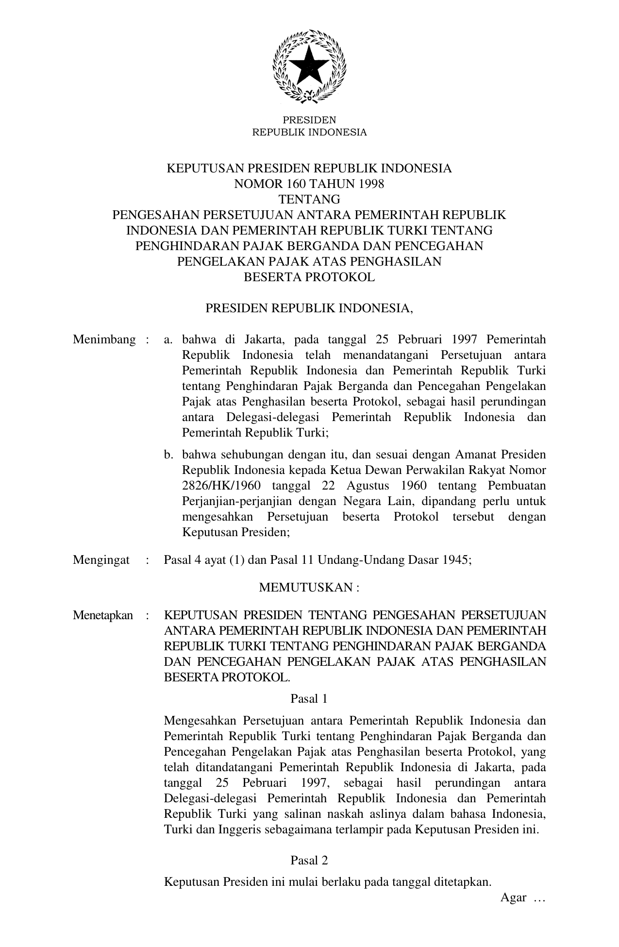 KEPPRES Nomor 160 Tahun 1998 | Keputusan Presiden Nomor 160 Tahun 1998 tentang PENGESAHAN PERSETUJUAN ANTARA PEMERINTAH REPUBLIK INDONESIA DAN PEMERINTAH REPUBLIK TURKI TENTANG PENGHINDARAN PAJAK BERGANDA DAN PENCEGAHAN PENGELAKAN PAJAK ATAS PENGHASILAN BESERTA PROTOKOL