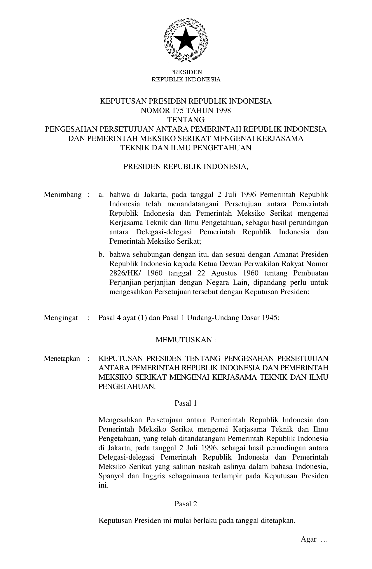 KEPPRES Nomor 175 Tahun 1998 | Keputusan Presiden Nomor 175 Tahun 1998 tentang PENGESAHAN PERSETUJUAN ANTARA PEMERINTAH REPUBLIK INDONESIA DAN PEMERINTAH MEKSIKO SERIKAT MFNGENAI KERJASAMA TEKNIK DAN ILMU PENGETAHUAN