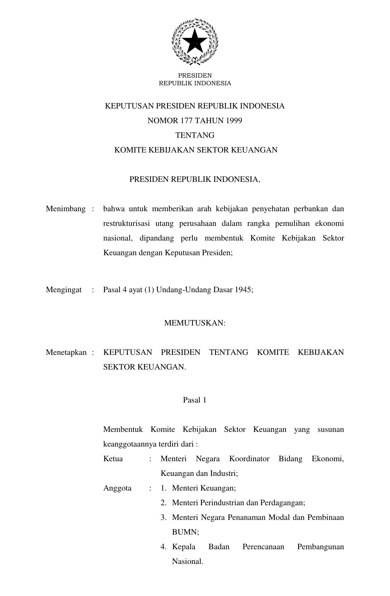 KEPPRES Nomor 177 Tahun 1999 | Keputusan Presiden Nomor 177 Tahun 1999 tentang KOMITE KEBIJAKAN SEKTOR KEUANGAN